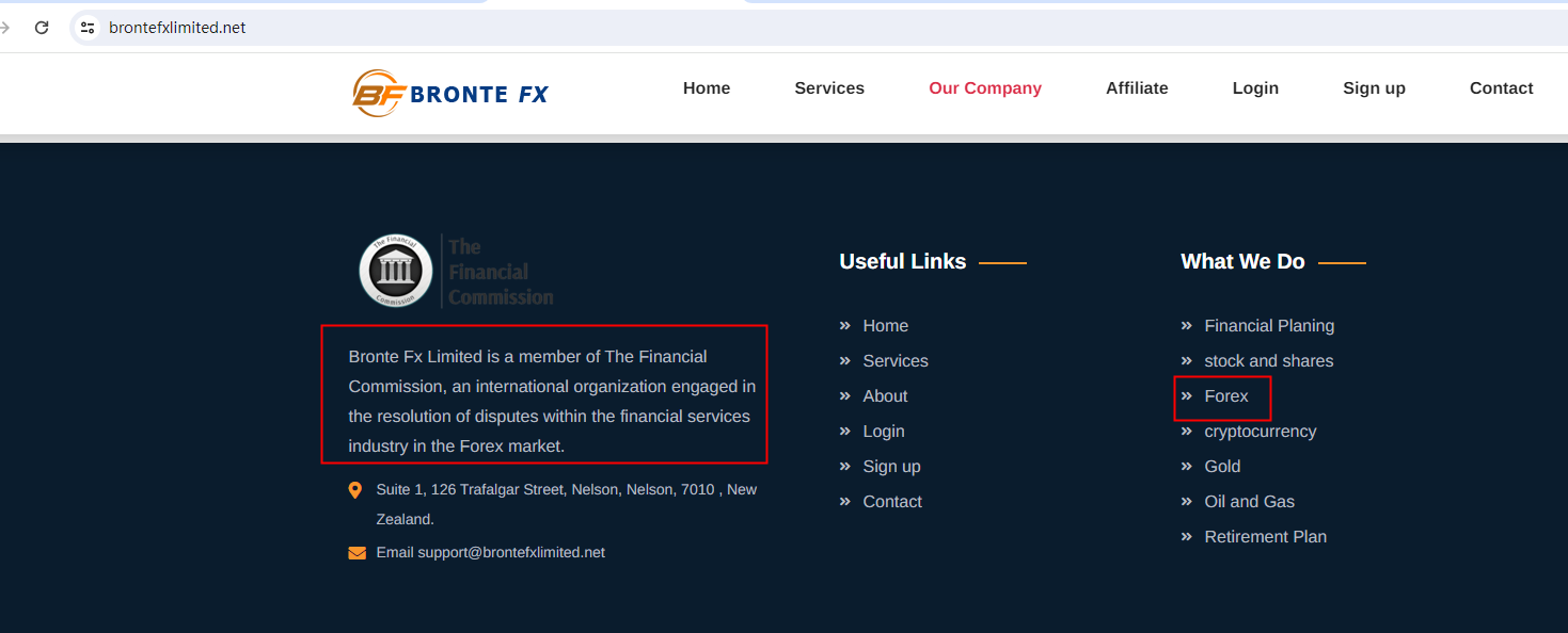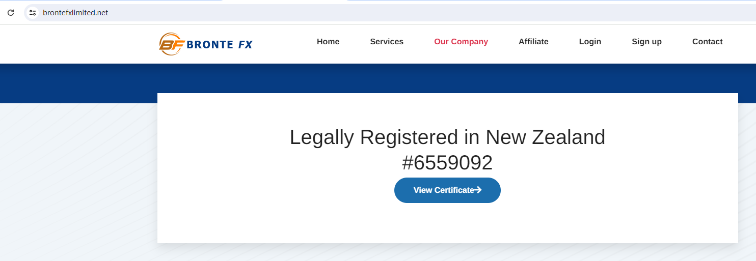 Bronte FX claims to be registered in New Zealand, but the Financial Markets Authority (FMA) issued a warning that Bronte FX was providing finacial services or products without registration. It falsely claims to be a registered company in New Zealand, using the address and business registration details of another company, Bronte Investments Limited. A representative of Bronte Investments Limited has confirmed that their company is not associated with this website. It is a red flag.
