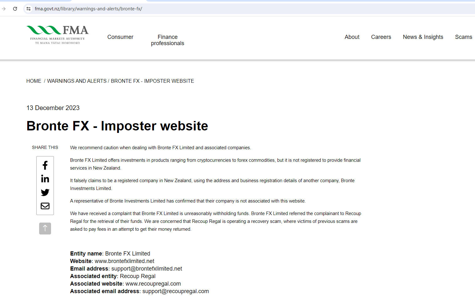 On 13 December 2023, the Financial Markets Authority (FMA) issued a warning that Bronte FX was providing financial services or products without registration. It falsely claims to be a registered company in New Zealand, using the address and business registration details of another company, Bronte Investments Limited. A representative of Bronte Investments Limited has confirmed that their company is not associated with this website. You may visit: https://www.fma.govt.nz/library/warnings-and-alerts/bronte-fx/