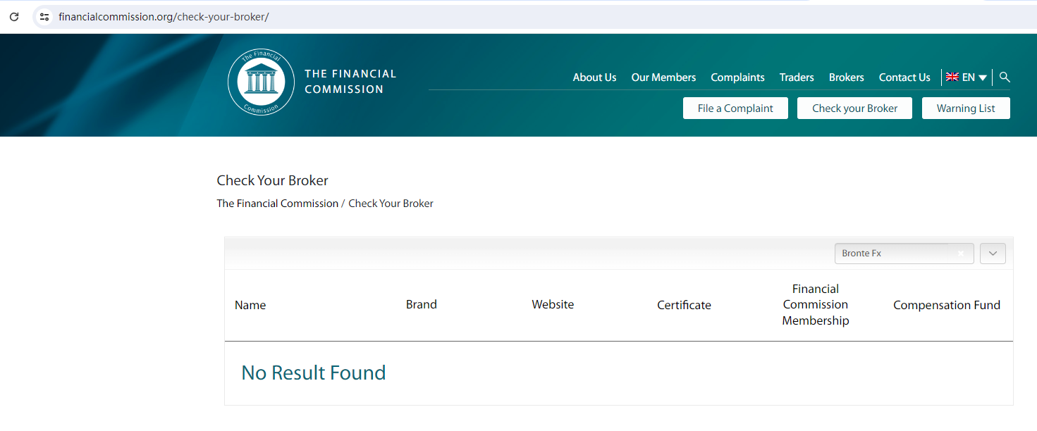 Bronte FX also claims to be regulated by The Financial Commission (FinCom), we searched the FinCom but found no matching results.