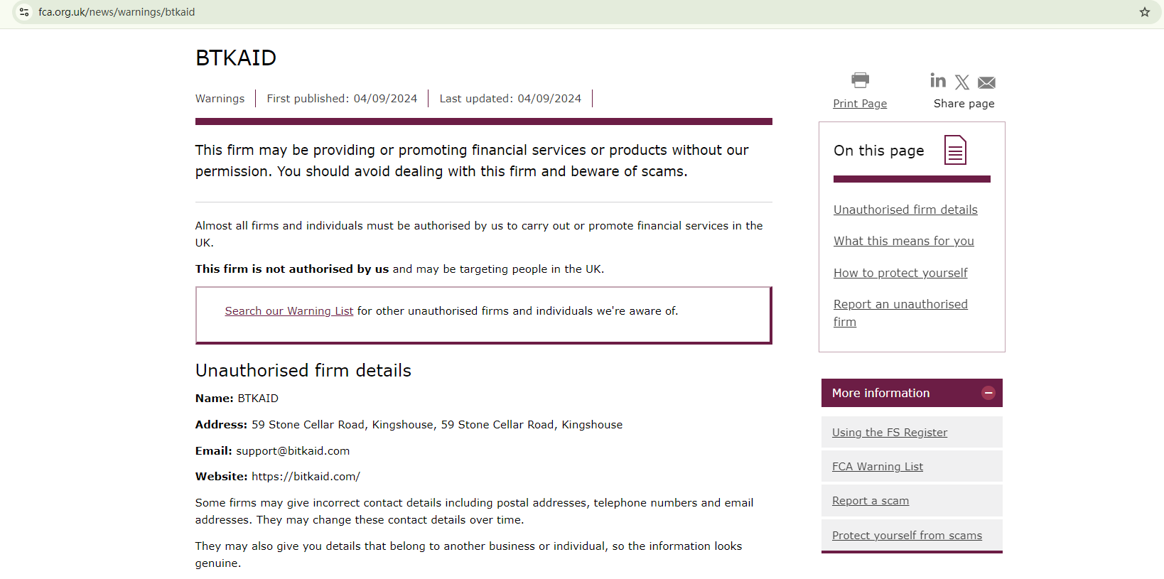 On September 4, 2024, the Financial Conduct Authority (FCA) issued a warning against BTKAID, believing this company might be providing financial services or products without proper authorization in the UK. https://www.fca.org.uk/news/warnings/btkaid