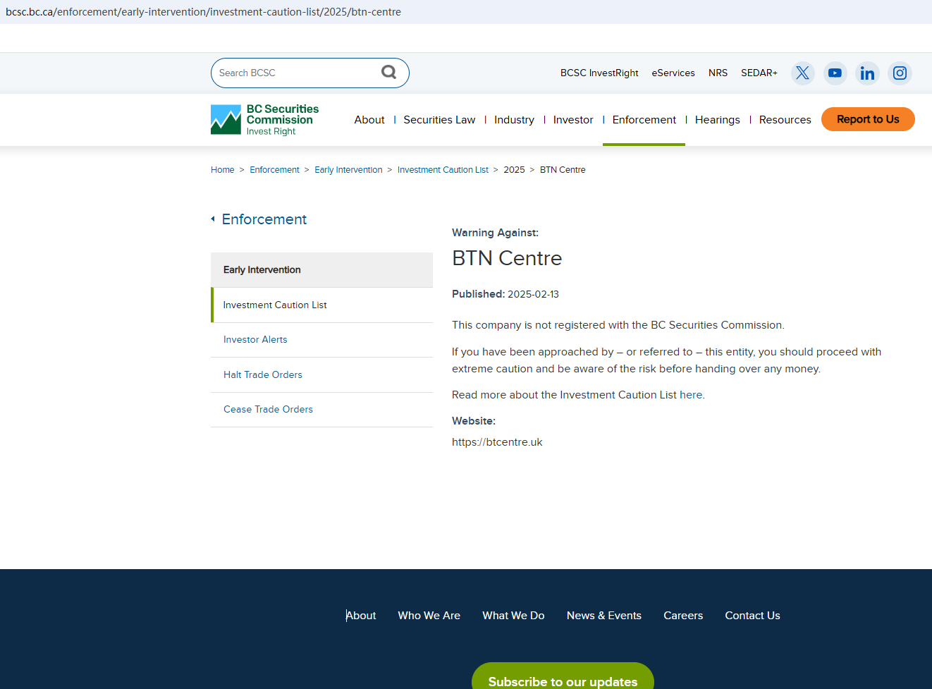 On 13 February 2025, the British Columbia Securities Commission (BCSC) issued a warning that BTN Centre was providing financial services or products without authorisation. You may visit: https://www.bcsc.bc.ca/enforcement/early-intervention/investment-caution-list/2025/btn-centre