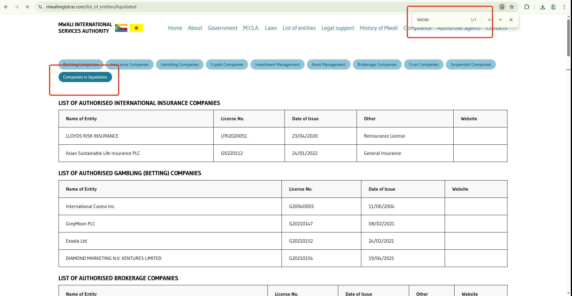 Upon investigation, we can confirm that WSYM Technology is listed as an authorized company by the Mwali International Services Authority (MISA). However, please note that MISA currently lists the company as a liquidated company, which indicates that the company may not be able to operate and poses a potential risk to investors.