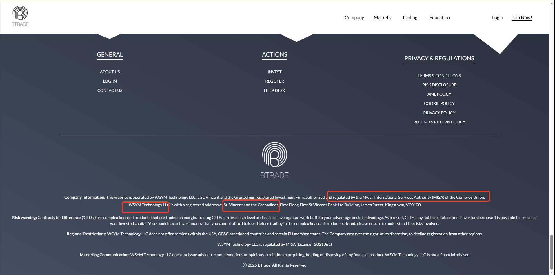 BTrade claims to be operated by WSYM Technology LLC, an investment company registered in St. Vincent and the Grenadines and authorized and regulated by the Mwali International Services Authority (MISA) of the Union of the Comoros.