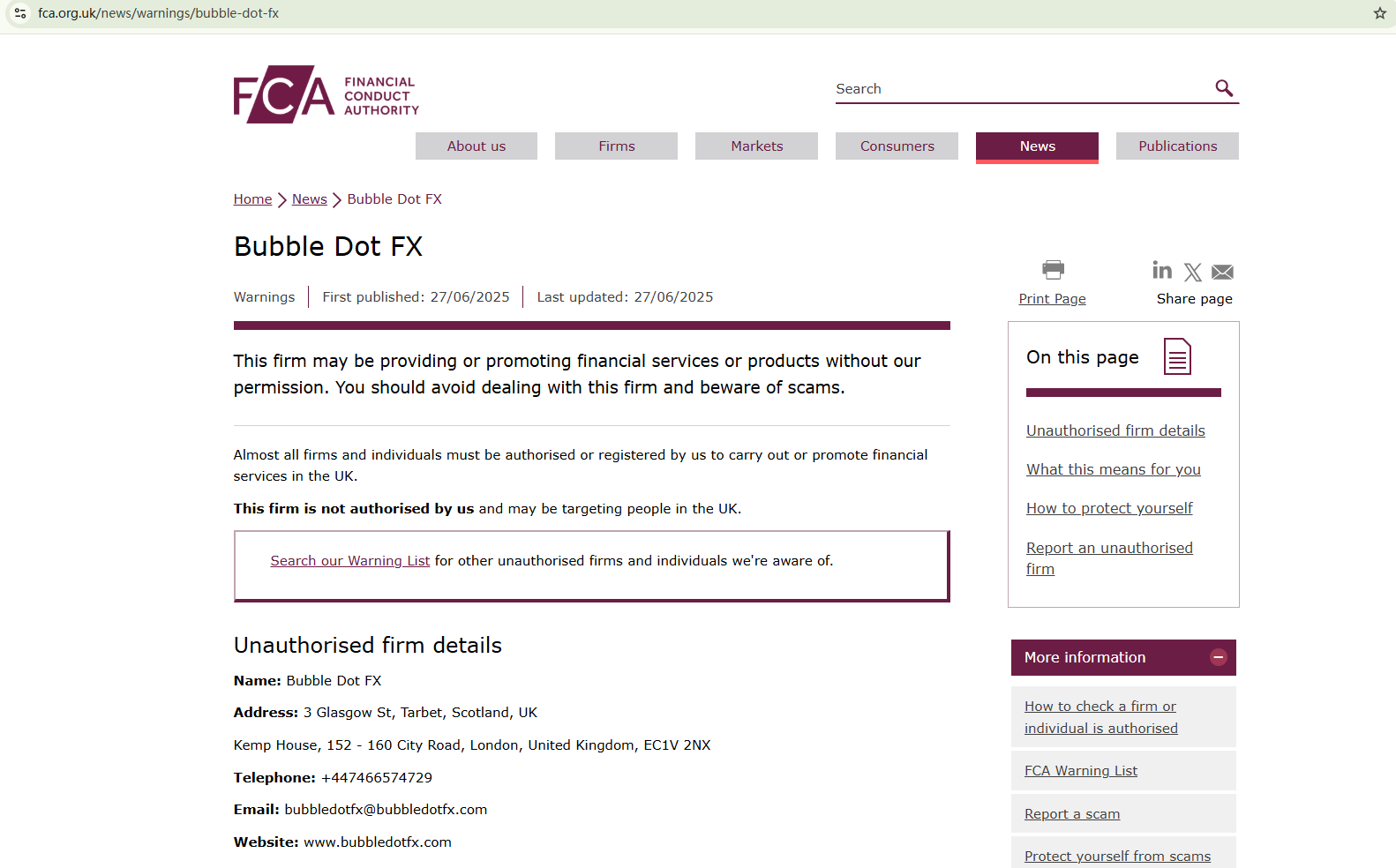 Bubble Dot FX is a suspected fraudulent broker that fails to provide any regulatory information. It only discloses that it is based in the UK,but upon investigation, we found that it is not authorized by the UK’s Financial Conduct Authority (FCA). And in fact, the FCA has listed it on its warning list due to concerns over illegal financial activities. Therefore, Bubble Dot FX appears to be a scam.