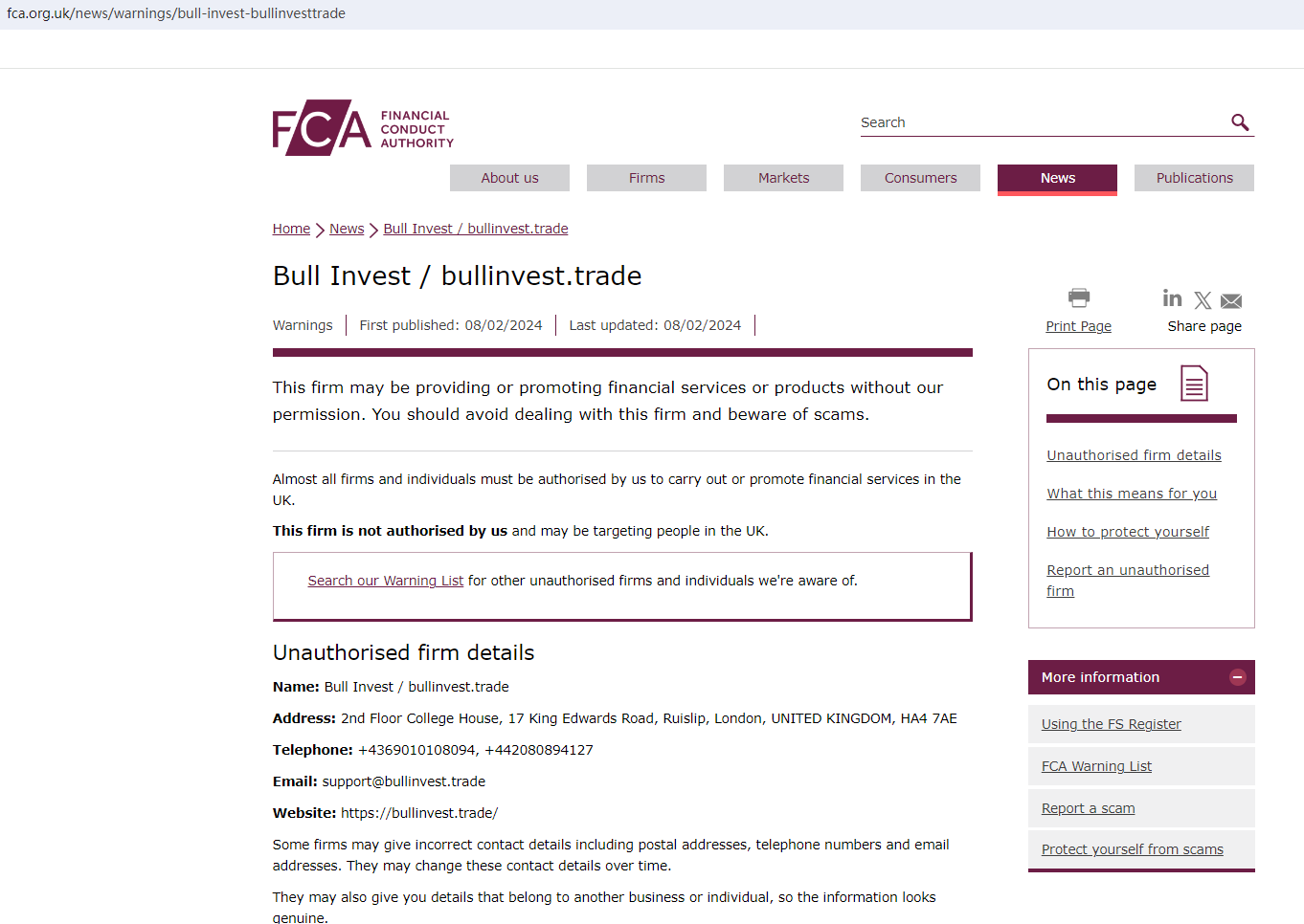On 8 February 2024, the United Kingdom Financial Conduct Authority (UK FCA) issued a warning that Bull Invest was providing financial services or products in the UK without authorisation. You may visit: https://www.fca.org.uk/news/warnings/bull-invest-bullinvesttrade