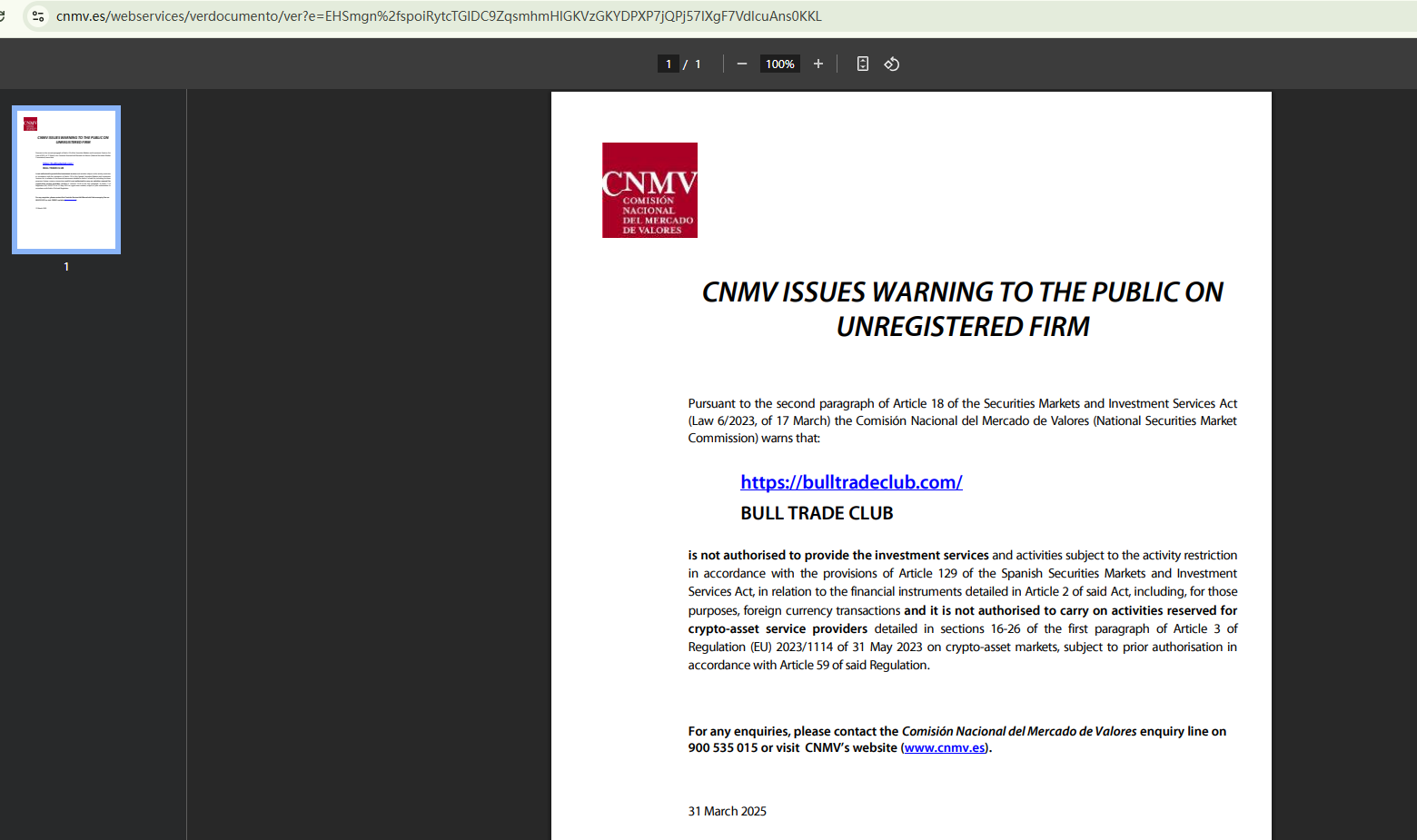 On March 31, 2025, the Comisión Nacional del Mercado de Valores (CNMV) has added BULL TRADE CLUB to its warning list for providing investment services without authorization. https://www.cnmv.es/Portal/ResultadoBusqueda?tipo=1&nombre=BULLTRADECLUB