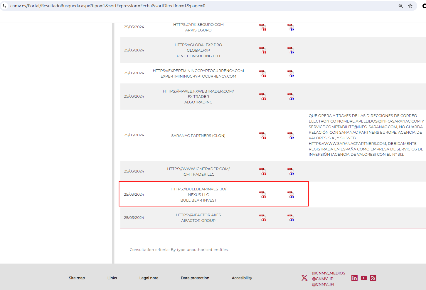 On March 25, 2024, the Comisión Nacional del Mercado de Valores (CNMV) added BULL BEAR INVEST to its warning list for providing investment services without authorization. https://www.cnmv.es/Portal/ResultadoBusqueda.aspx?tipo=1&sortExpression=Fecha&sortDirection=1&page=0