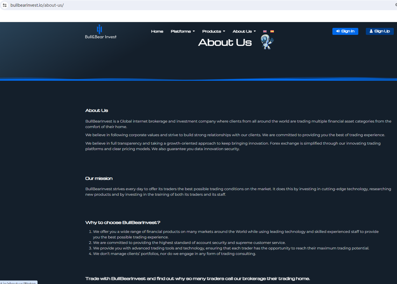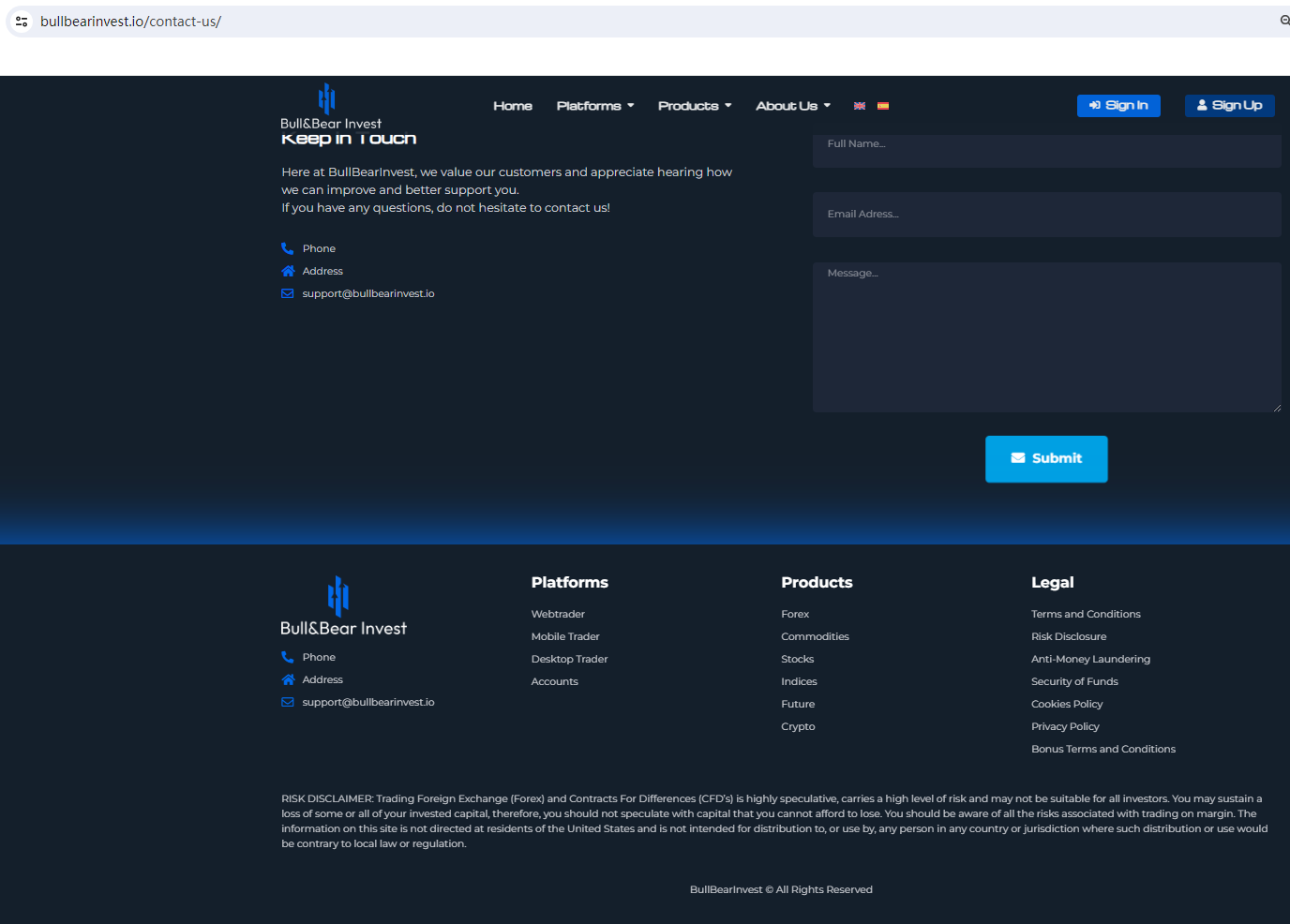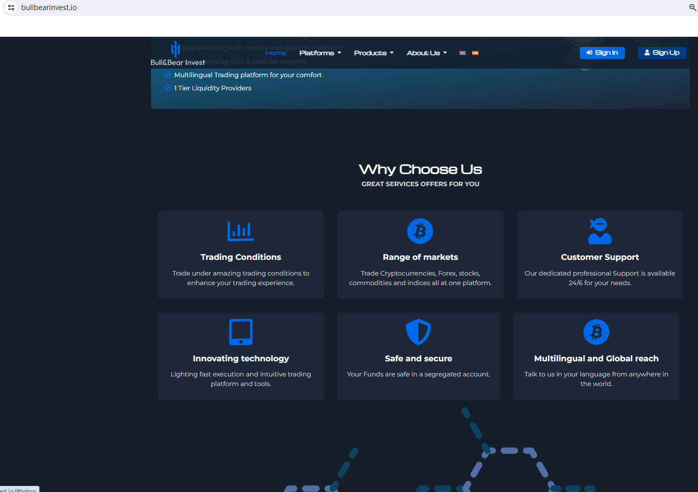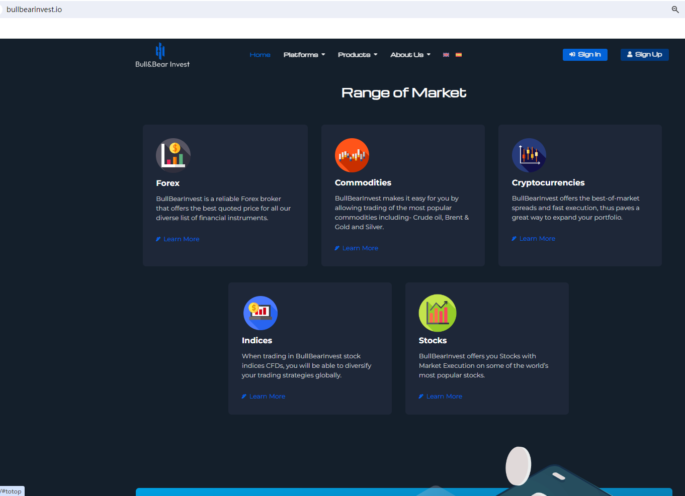 BULL BEAR INVEST claims to be a reliable company without presenting any information about its regulation or contact. The lack of such important information may be a distinct signal of an unlicensed broker, as regulated companies always present their accreditations and licenses in a prominent position. It is a red flag.