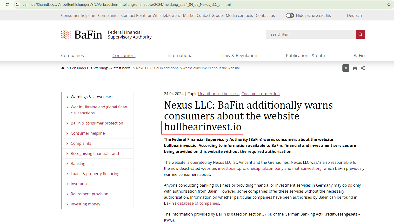 On 24 April 2024, the Federal Financial Supervisory Authority (BaFin) warneds consumers about the website bullbearinvest.io and the unauthorized provision of financial and investment services through this website. https://www.bafin.de/SharedDocs/Veroeffentlichungen/EN/Verbrauchermitteilung/unerlaubte/2024/meldung_2024_04_09_Nexus_LLC_en.html