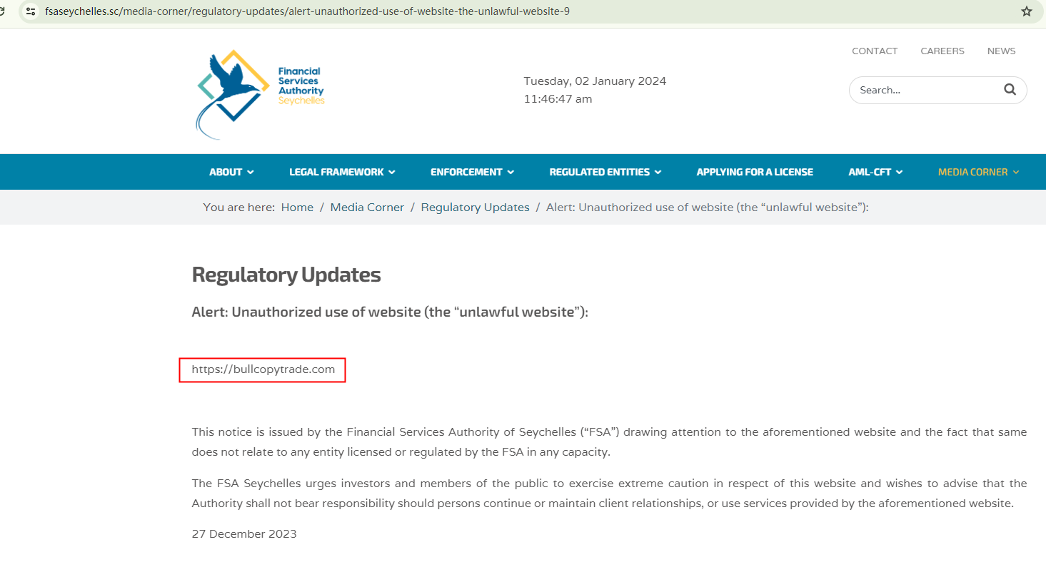 On December 27, 2023, the Seychelles Financial Services Authority (Seychelles FSA) issued a warning against BULLCOPYTRADE, saying it is not related to any entity licensed or regulated by the FSA in any capacity. https://fsaseychelles.sc/media-corner/regulatory-updates/alert-unauthorized-use-of-website-the-unlawful-website-9
