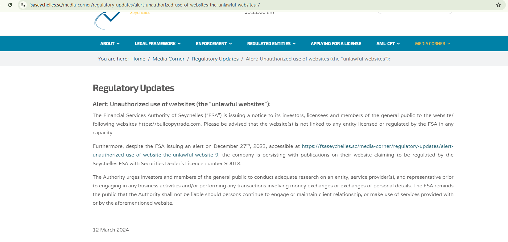 On March 12, 2024, the Seychelles Financial Services Authority (Seychelles FSA) issued a statement addressing the ongoing issue with BULLCOPYTRADE. Despite the previous warning from the FSA, BULLCOPYTRADE continues to assert on their website that they are regulated by the Seychelles FSA and hold a Securities Dealer's Licence, number SD018. The FSA has categorically refuted these claims. https://fsaseychelles.sc/media-corner/regulatory-updates/alert-unauthorized-use-of-websites-the-unlawful-websites-7