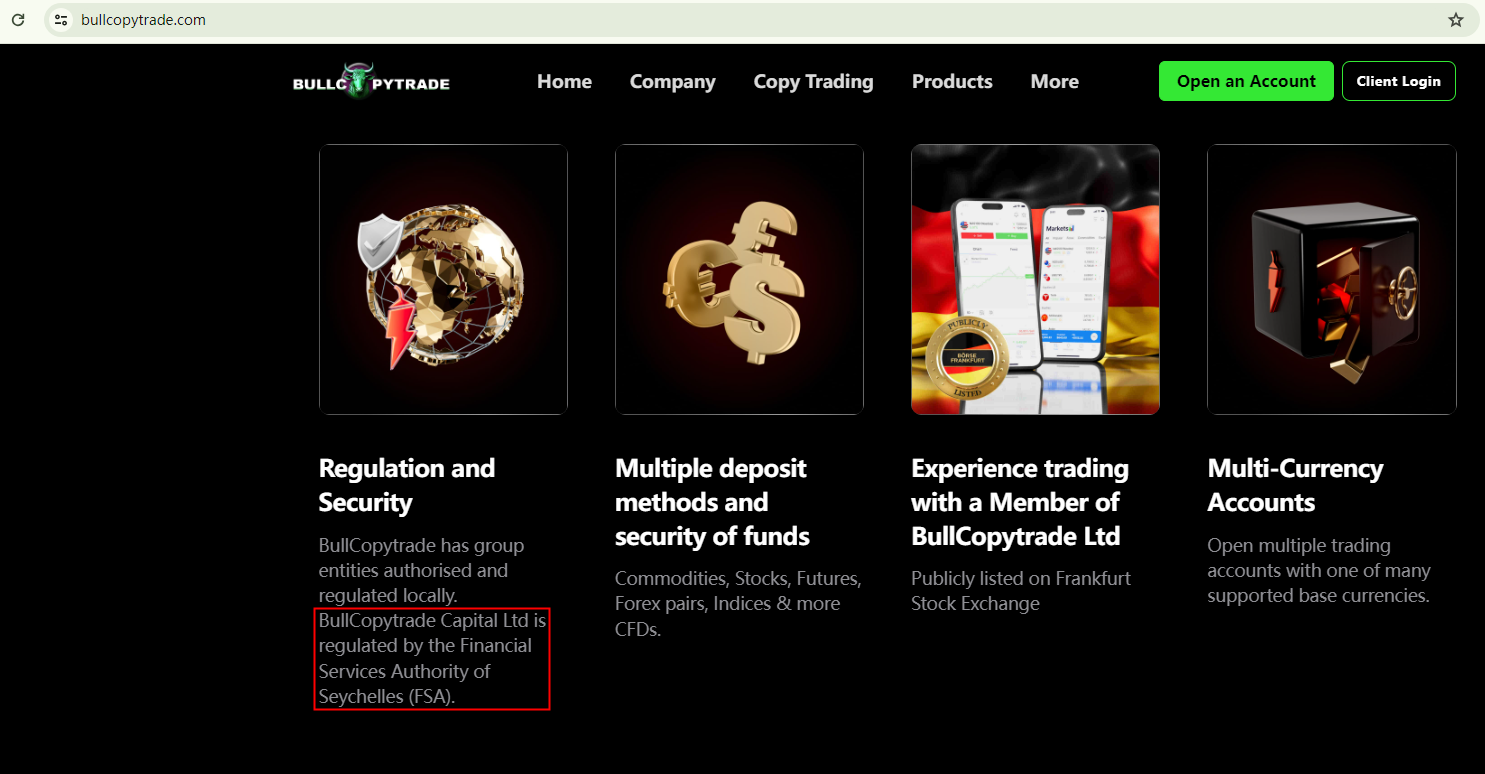 BULLCOPYTRADE claims that it is an entity regulated by the Seychelles Financial Services Authority (Seychelles FSA).