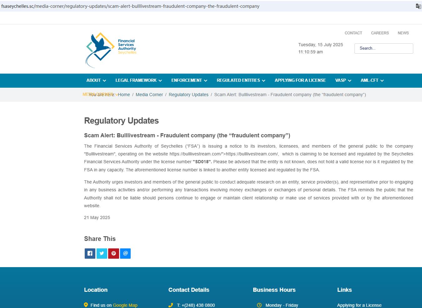 On May 21, 2025, the Seychelles Financial Services Authority (Seychelles FSA) issued a warning against Bulllivestream for the lack of the required authorization. https://fsaseychelles.sc/media-corner/regulatory-updates/scam-alert-bulllivestream-fraudulent-company-the-fraudulent-company