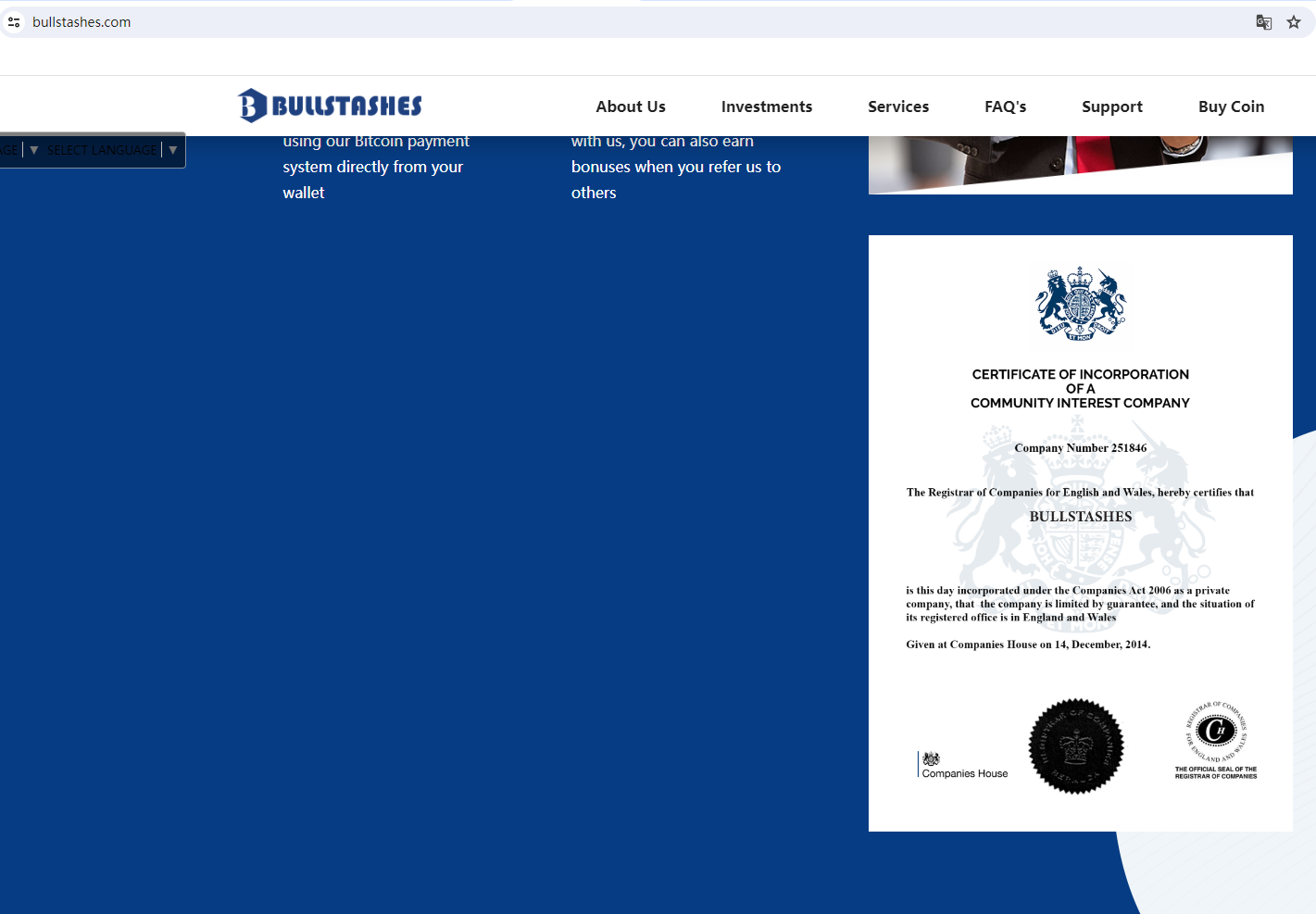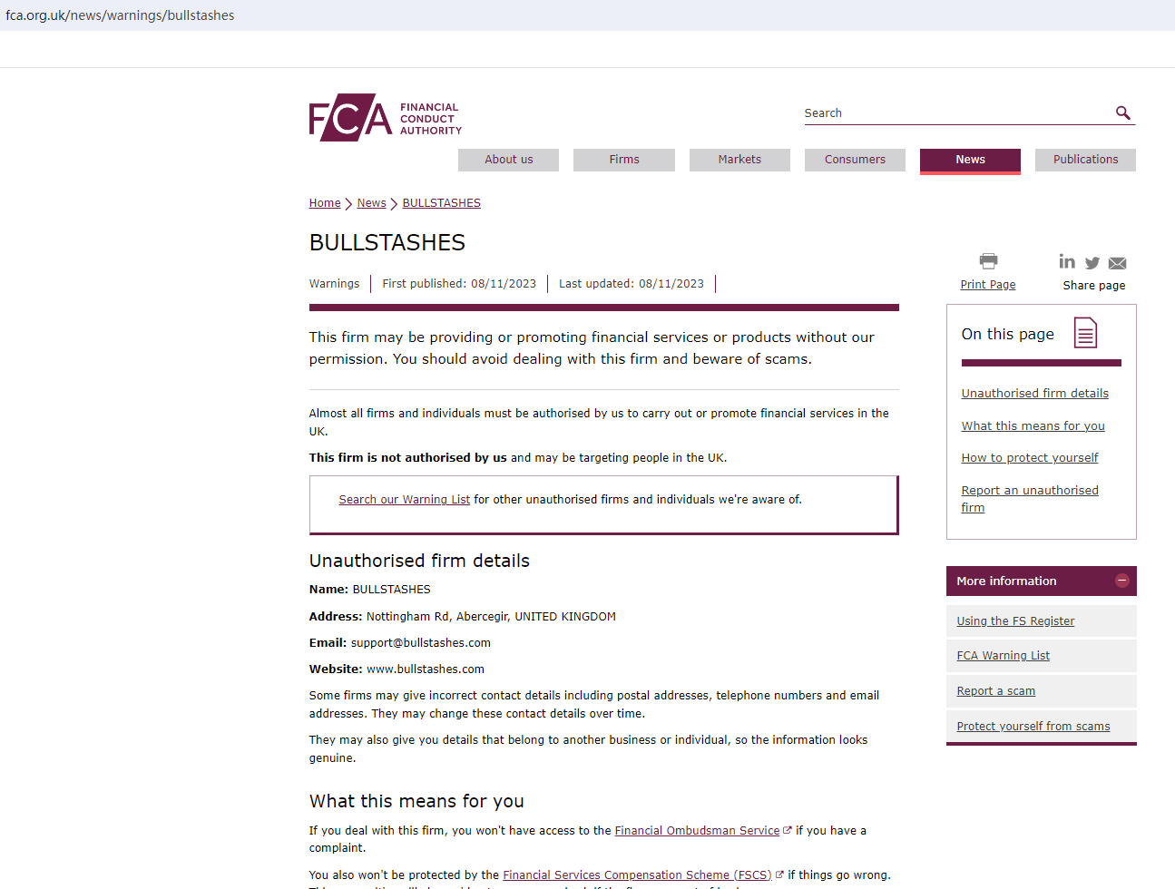On 8 November 2023, the United Kingdom Financial Conduct Authority (UK FCA) issued a warning that BULLSTASHES was providing financial services or products in the UK without authorisation. You may visit: https://www.fca.org.uk/news/warnings/bullstashes