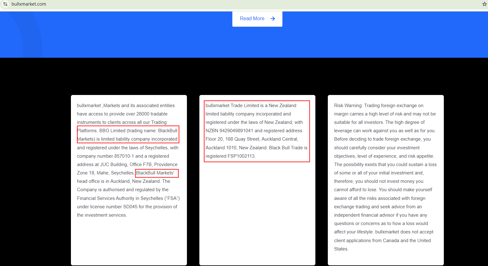 BullXMarket falsely claims to be associated with Black Bull Group Limited, which operates in New Zealand as Blackbull Markets. The New Zealand Financial Markets Authority (NZ FMA) has identified several websites, including BullXMarket, that misuse the registration details of Black Bull Group Limited, a registered entity in New Zealand. Black Bull Group Limited has confirmed it is not associated with these websites. Therefore, BullXMarket is clearly a scam.