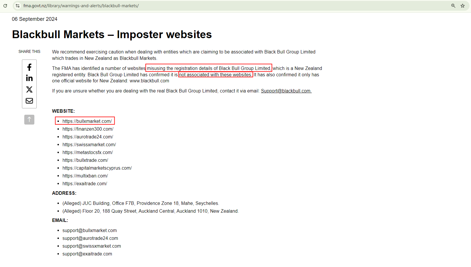 On Sep 6, 2024, the New Zealand Financial Markets Authority (NZ FMA) issued a warning about a list of imposter websites that falsely claim to be associated with Black Bull Group Limited. This blacklist includes BullXMarket. https://www.fma.govt.nz/library/warnings-and-alerts/blackbull-markets/