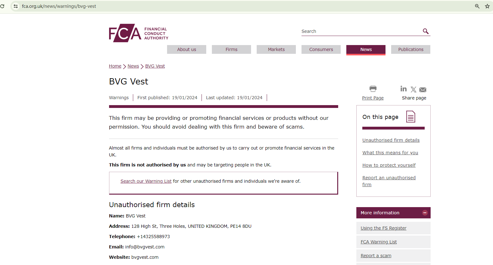 In addition, the Financial Conduct Authority (FCA) has issued a warning against BVG Vest, identifying it as an unauthorized firm in the UK.