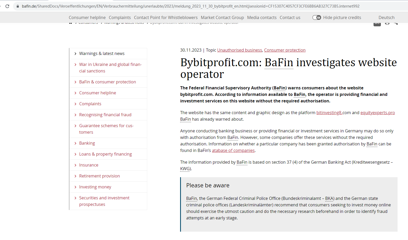 The Federal Financial Supervisory Authority (BaFin) issued a warning that ByBitProfit was providing finacial services or products without authorisation.