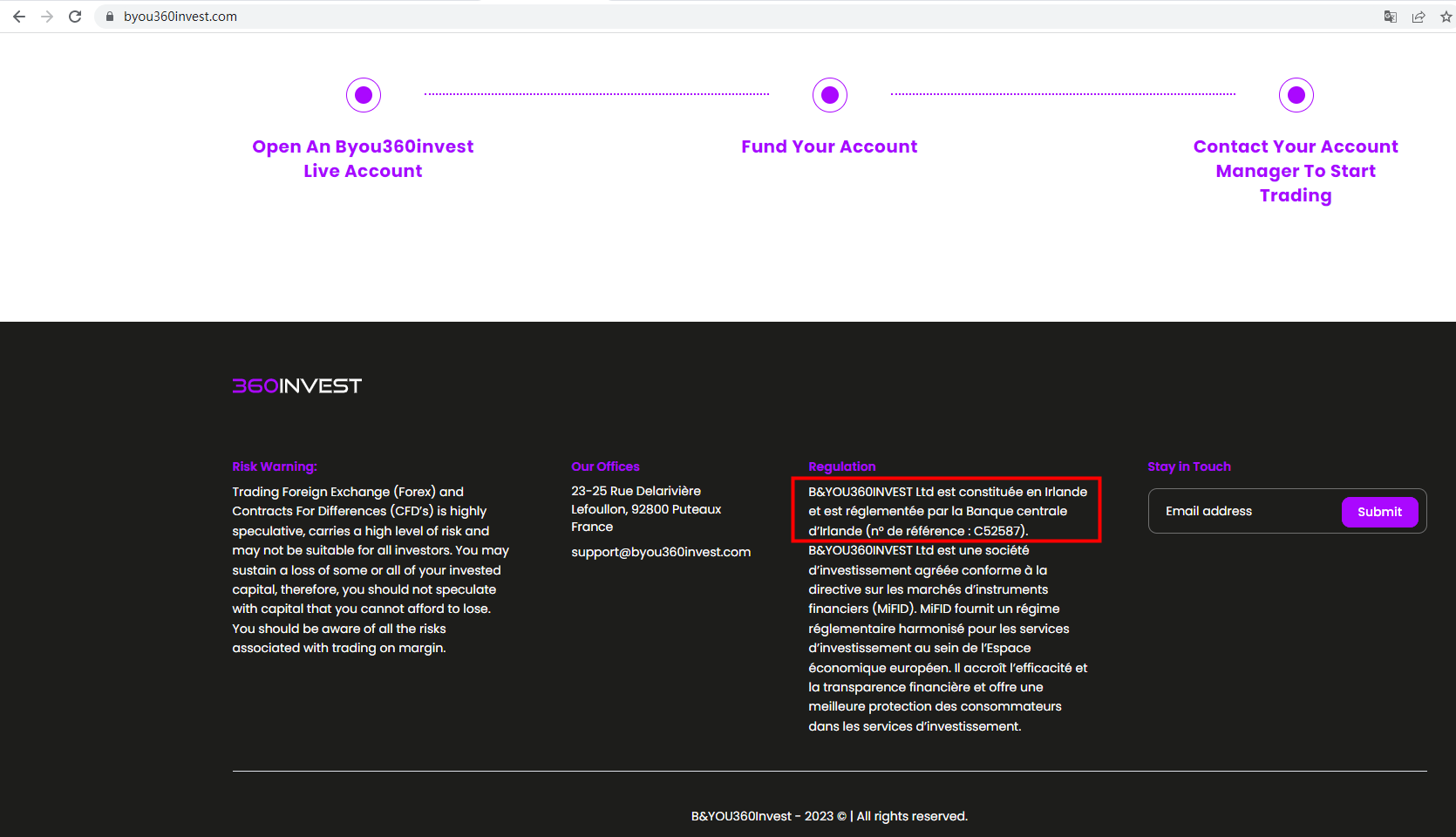 Byou360invest claims to be regulated by Central Bank of Ireland (CBI). But we don't find the correct information on CBI matching to Byou360invest. The truth is that Byou360invest is not under valid regulation by any regulators to do forex. Investors' funds in this broker are unsafe and cannot be protected by any law.