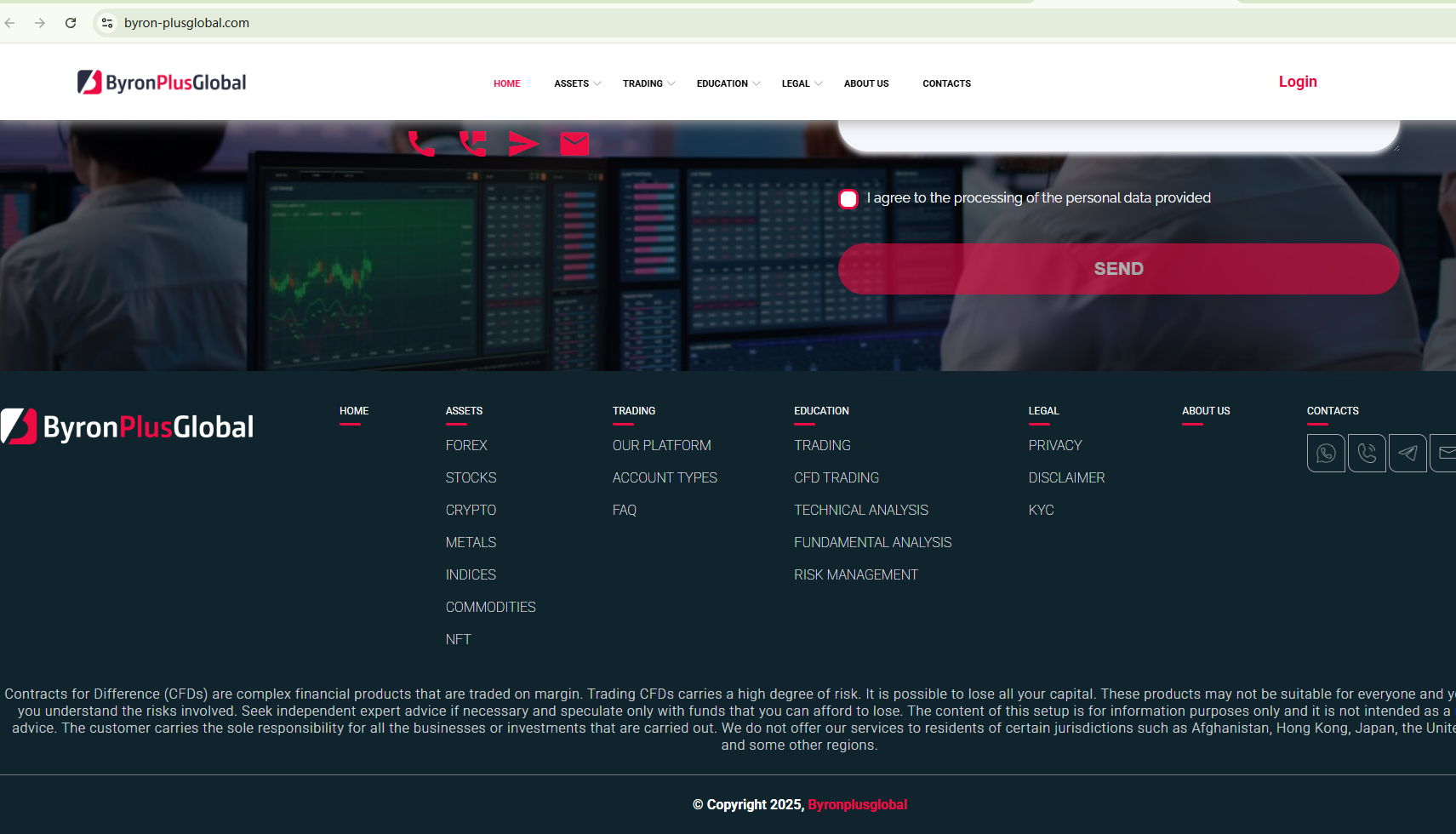 ByronPlusGlobal operates through two links, with one disabled currently. The trading platform, despte claiming to be a CFDs broker, hasn't disclosed any useful information about its legal structures and regulatory status. This lack of transparency raises a red flag. What's more, the Ontario Securities Commission (OSC) has issued a warning against ByronPlusGlobal, stating that this broker is not registered in Ontario to engage in the business of trading in securities.