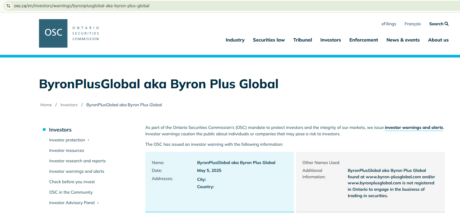 On May 5, 2025, the Ontario Securities Commission (OSC) issued a warning against ByronPlusGlobal, stating that this broker is not registered in Ontario to engage in the business of trading in securities. https://www.osc.ca/en/investors/warnings/byronplusglobal-aka-byron-plus-global