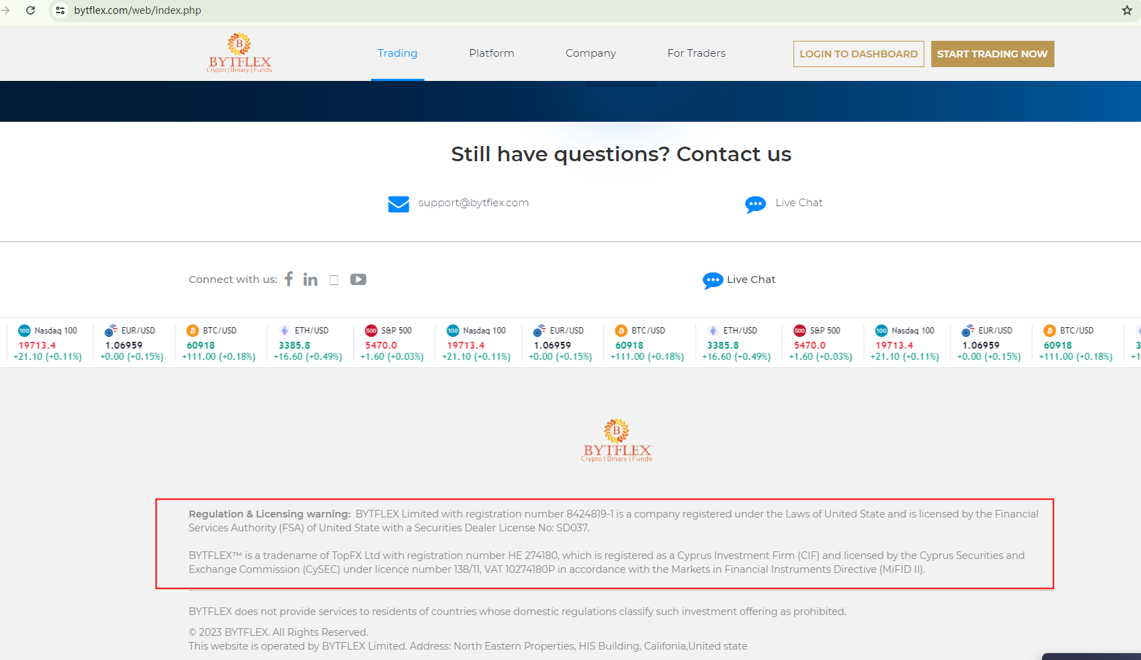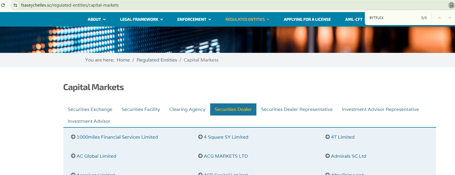BYTFLEX claims to be licensed by the Cyprus Securities and Exchange Commission (CySEC) and Seychelles Financial Services Authority (Seychelles FSA). However, the CySEC has added BYTFLEX to its warning list, refuting its claim of being authorized by them. As for the Seychelles FSA authorization claim, there are no matching records from the authority to substantiate it.