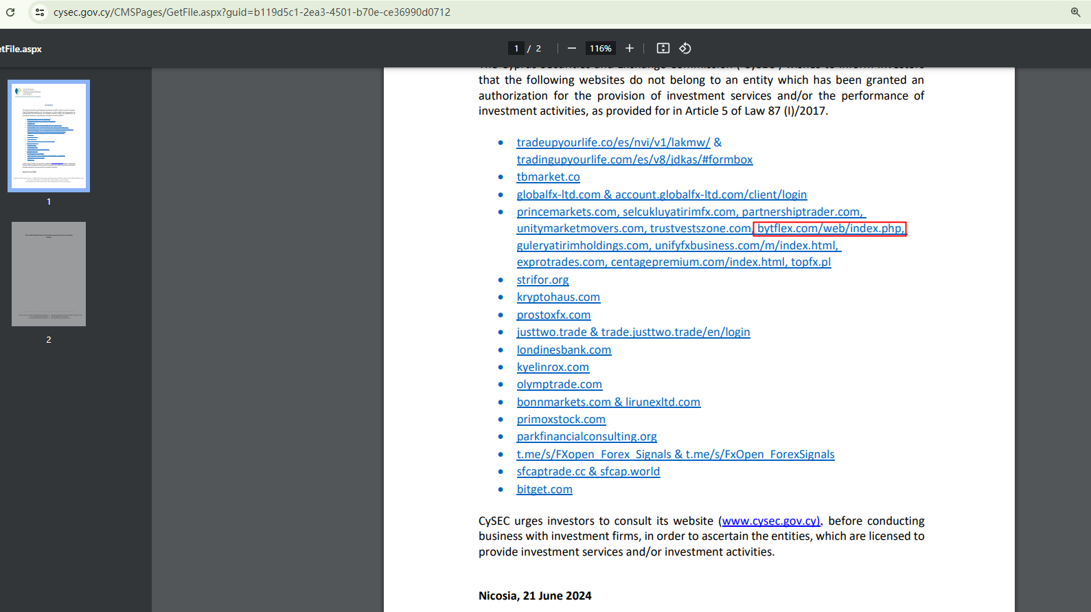 On June 21, 2024, the Cyprus Securities and Exchange Commission (CySEC) added BYTFLEX to its warning list, stating it does not belong to an entity which has been granted an authorization for the provision of investment services and/or the performance of investment activities. https://www.cysec.gov.cy/CMSPages/GetFile.aspx?guid=b119d5c1-2ea3-4501-b70e-ce36990d0712