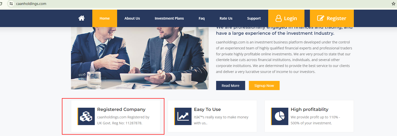 CAANHOLDINGS, which purports to be registered in the UK, has provided two registration numbers, 11287878 and 15145672, in an attempt to appear credible. However, records from the Companies House (CH) indicate that these two registration numbers are linked to entirely different entities, with no evidence supporting any connection to CAANHOLDINGS. This suggests that CAANHOLDINGS may be misappropriating the details of other entities to give the impression of legitimacy.