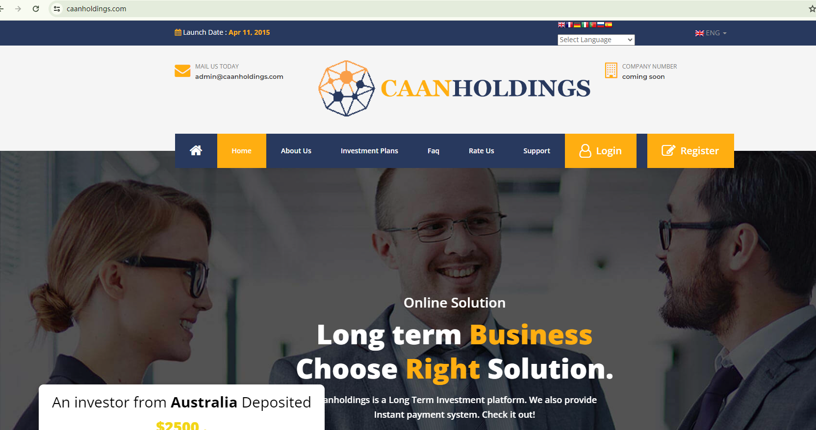 BrokersView found that the domain "https://www.caanholdings.com/" is currently inaccessible. This is widely regarded as a significant red flag, as the suspension of a broker's website often points to underlying regulatory or operational issues.