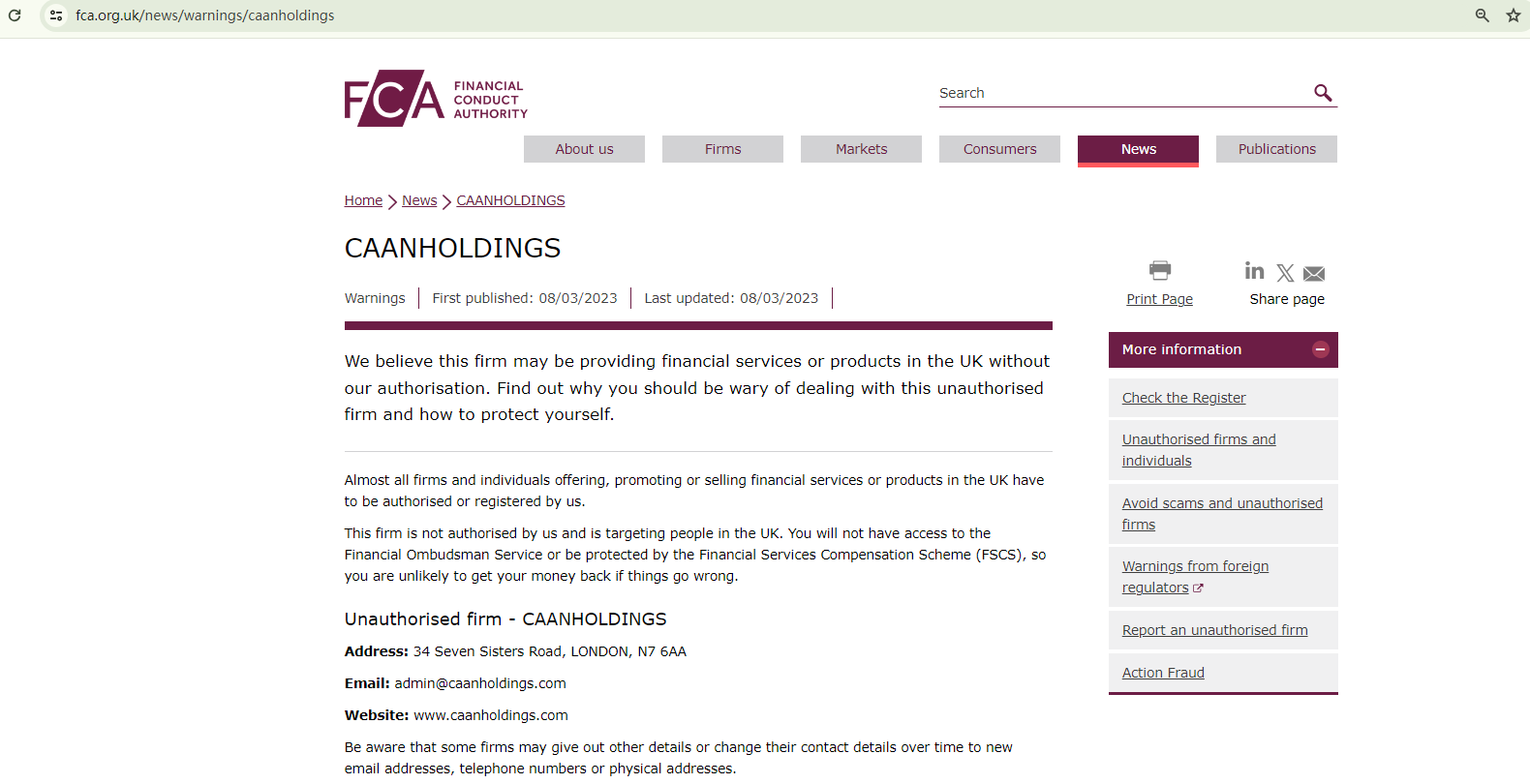 Furthermore, as a company claiming to be based in the UK, CAANHOLDINGS is obligated to obtain authorization from the Financial Conduct Authority (FCA) for its operations. Despite this requirement, it has not secured a license from the FCA. In fact, the British financial watchdog has issued a warning about CAANHOLDINGS, categorizing it as an unauthorized entity. This raises serious concerns about the company's legitimacy and compliance with regulatory standards. Investors should exercise caution when dealing with such entities.