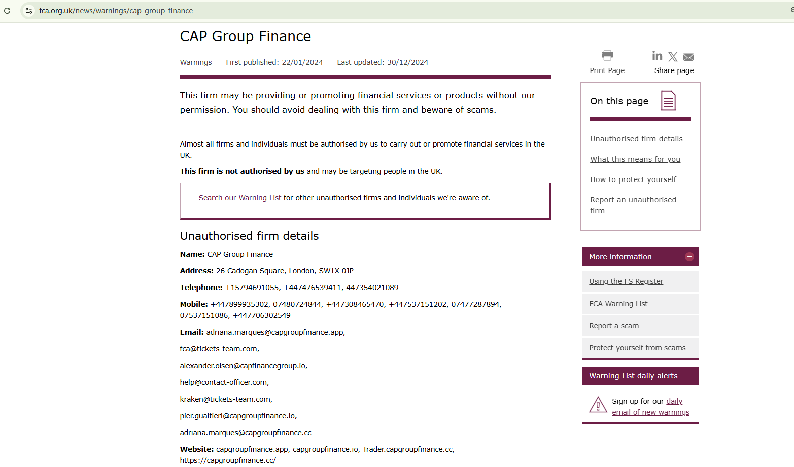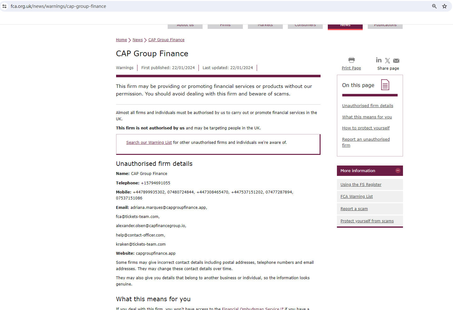 On 22 January 2024, the United Kingdom Financial Conduct Authority (UK FCA) issued a warning that CAP Group Finance was providing financial services or products in the UK without authorisation. You may visit: https://www.fca.org.uk/news/warnings/cap-group-finance
