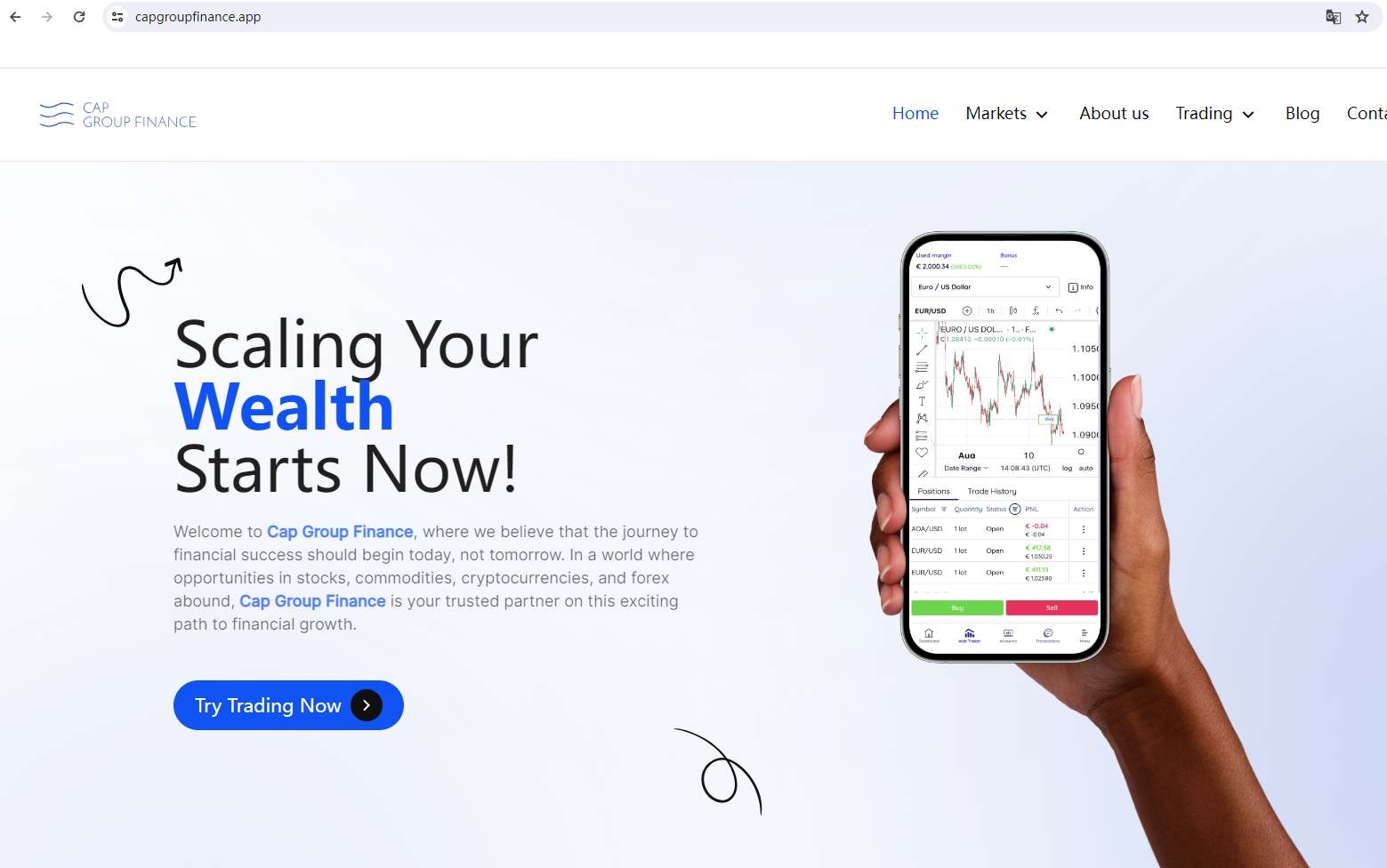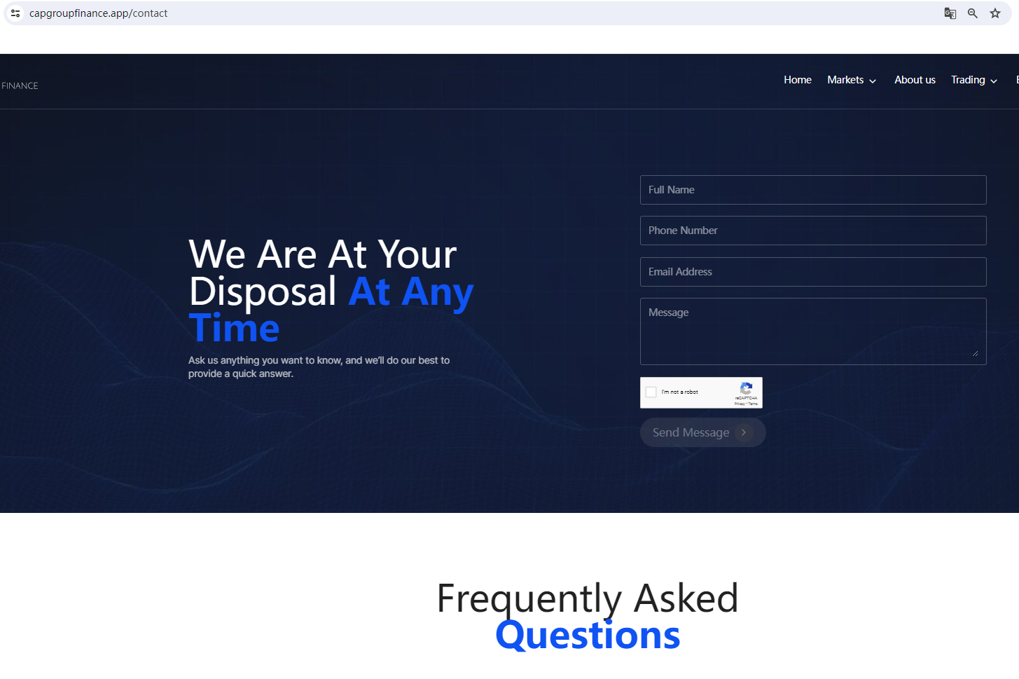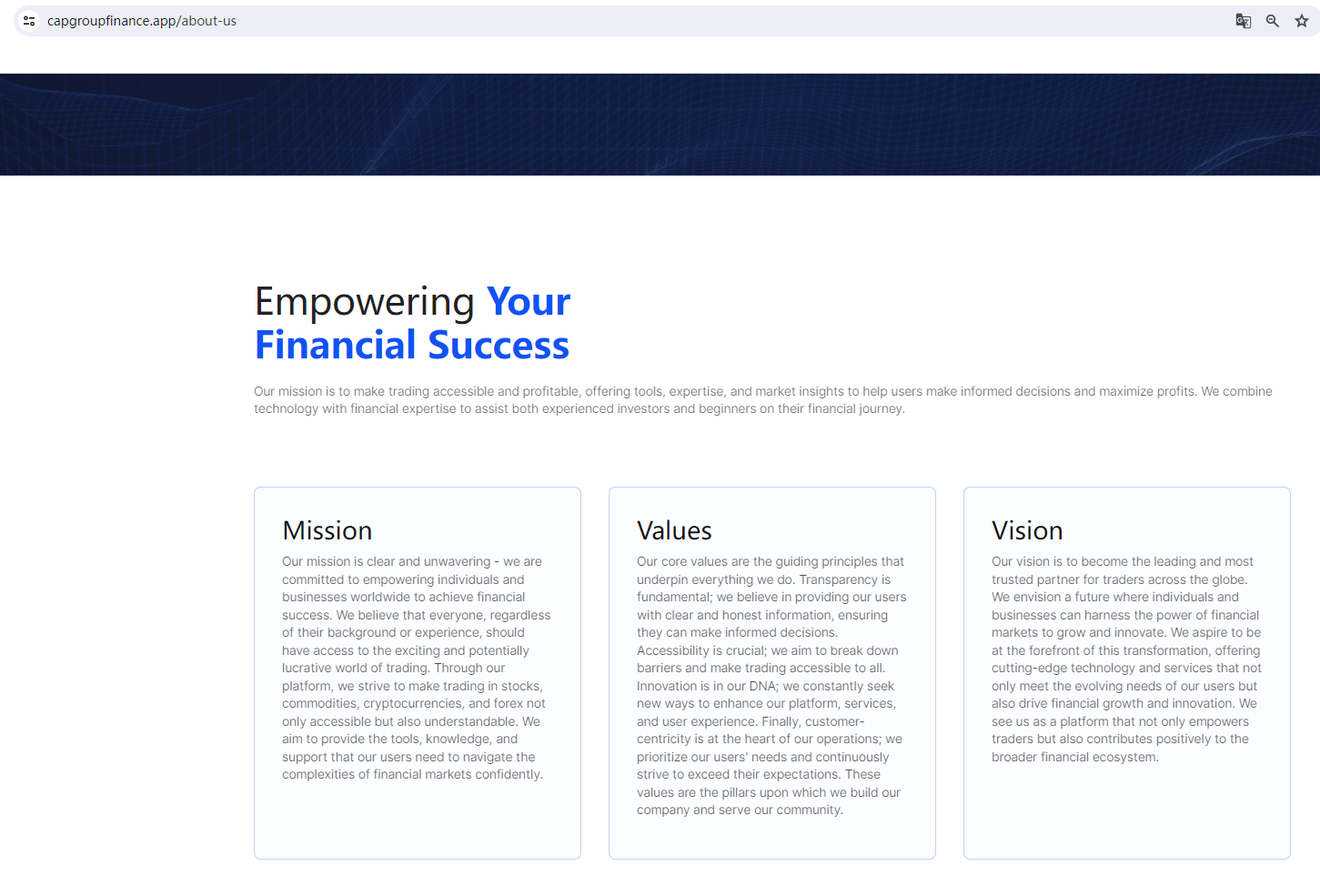 CAP Group Finance claims to be a reliable company without presenting any information about its regulation or contact. The lack of such important information may be a distinct signal of an unlicensed broker, as regulated companies always present their accreditations and licenses in a prominent position. It is a red flag.