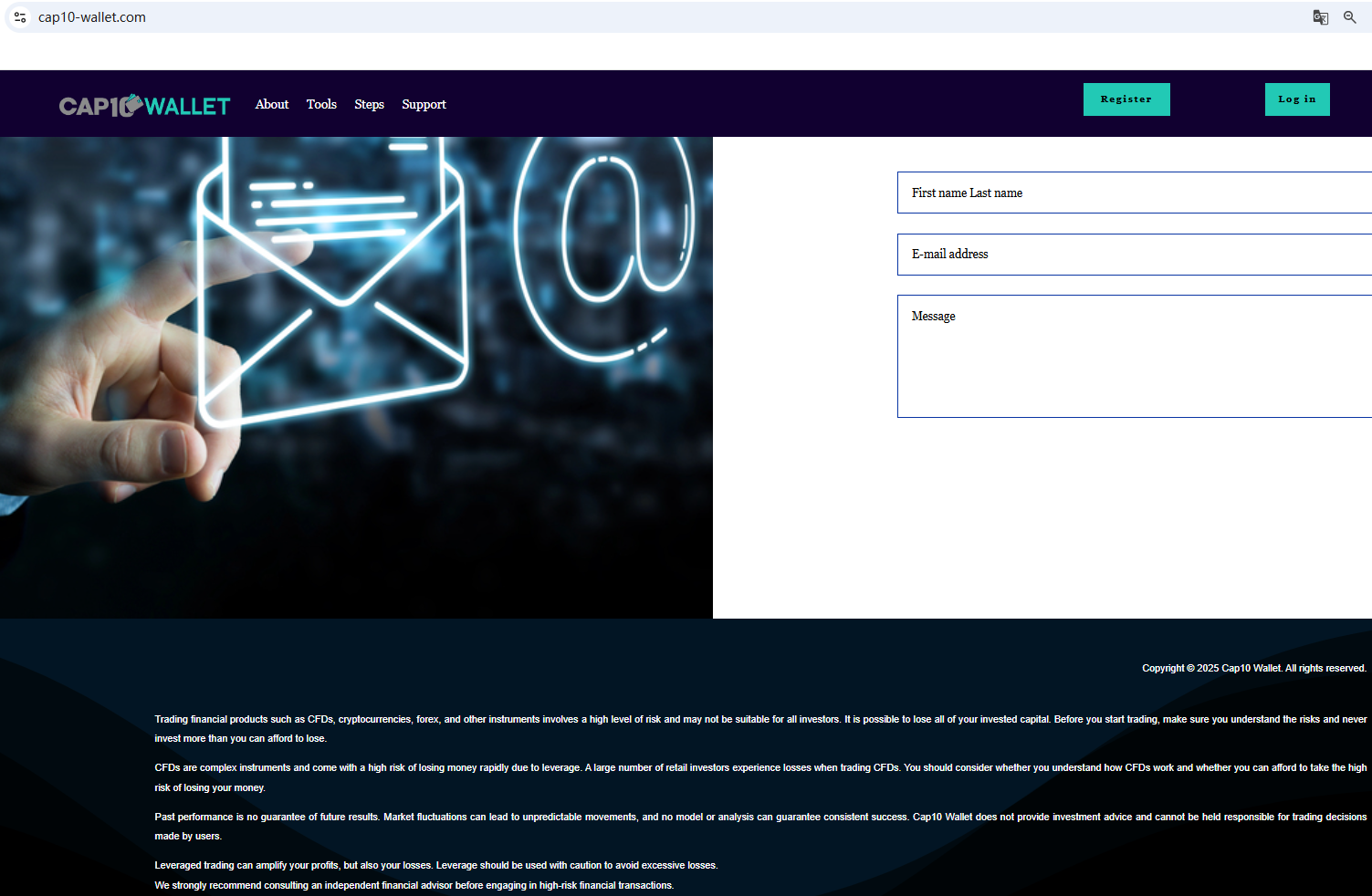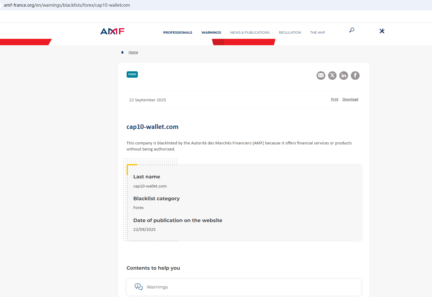 On Sept 22, 2025, the Financial Authority (Autorité des Marchés Financiers, AMF) added Cap10 Wallet to warning list for it being an unauthorized company engaging in forex activities. https://www.amf-france.org/en/warnings/blacklists/forex/cap10-walletcom