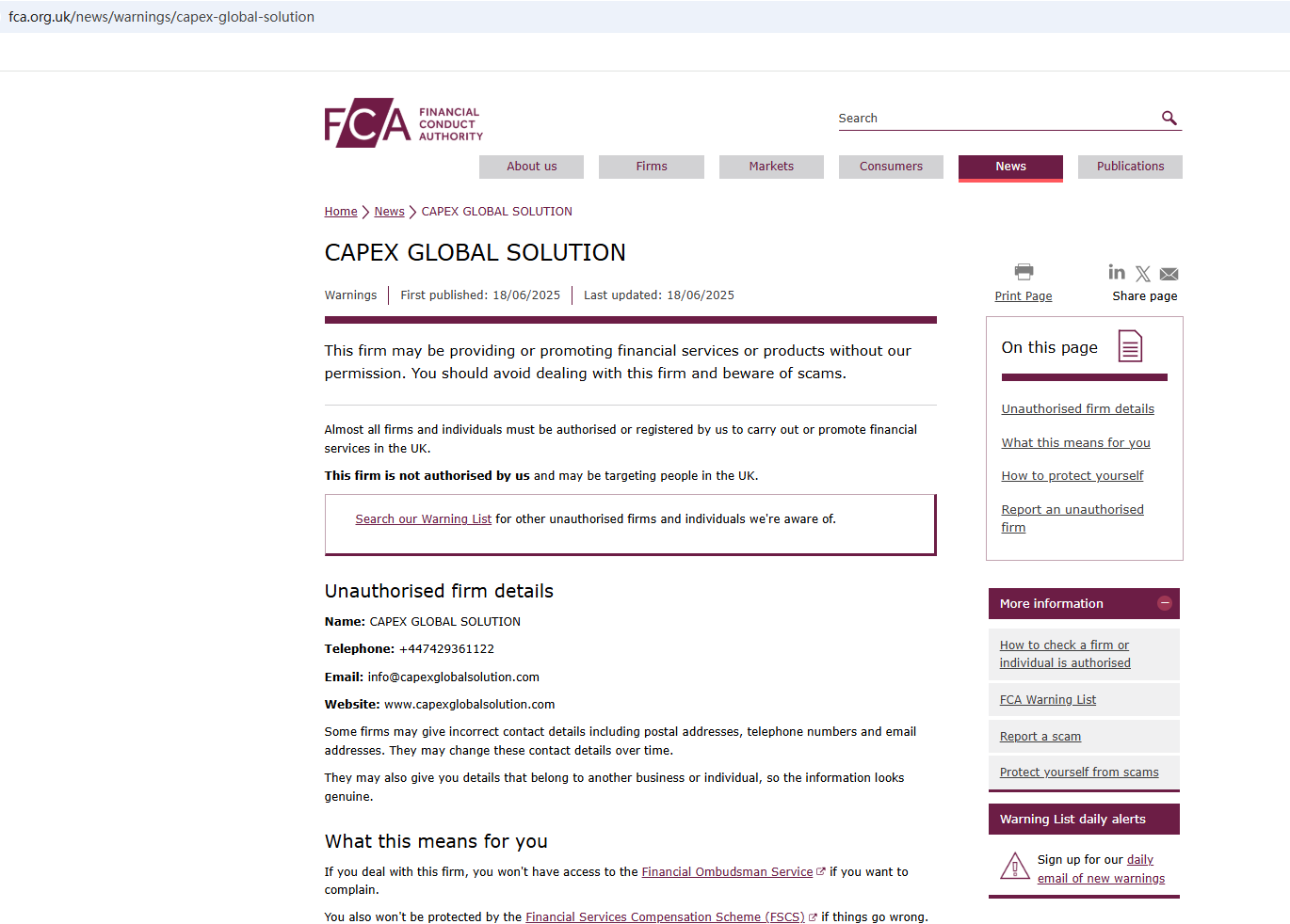 On Jun 18, 2025, the Financial Conduct Authority (FCA) issued a warning against CAPEX GLOBAL SOLUTION, believing this company might be providing financial services or products without proper authorization in the UK. https://www.fca.org.uk/news/warnings/capex-global-solution