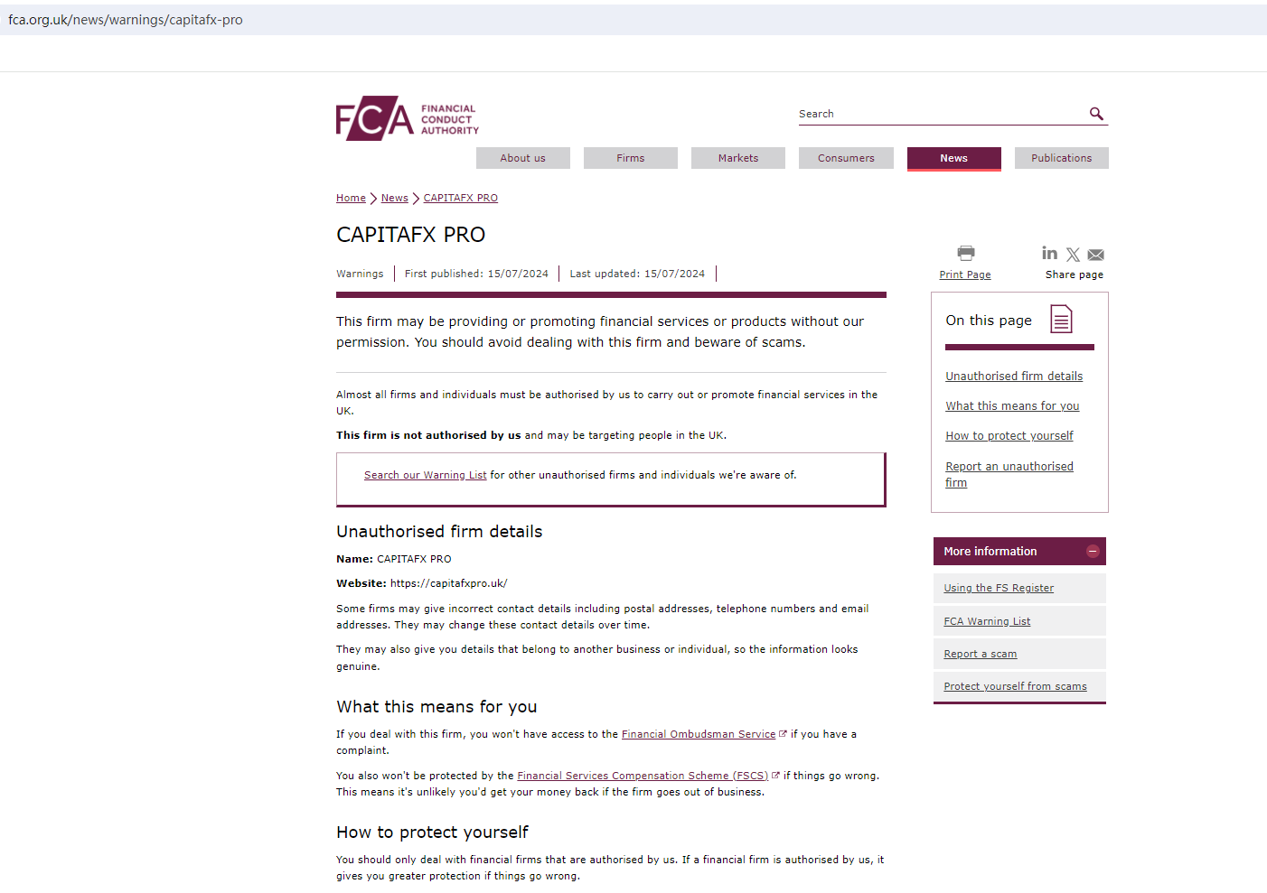 The United Kingdom Financial Conduct Authority (UK FCA) issued a warning that CAPITAFX PRO was providing finacial services or products without authorisation.