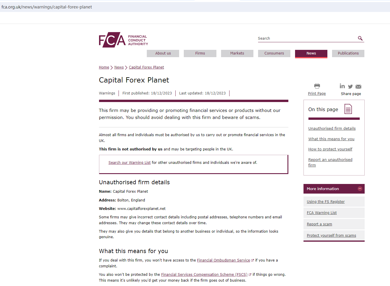 On 18 December 2023, the United Kingdom Financial Conduct Authority (UK FCA) issued a warning that Capital Forex Planet was providing financial services or products in the UK without authorisation. You may visit: https://www.fca.org.uk/news/warnings/capital-forex-planet