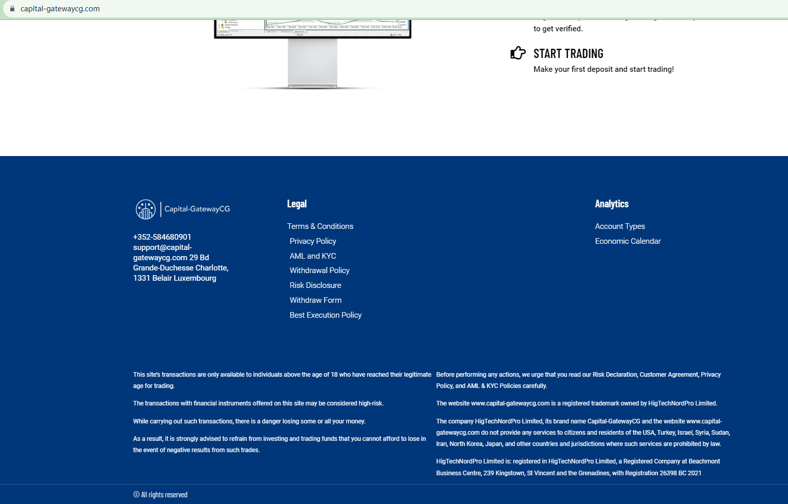While Capital GatewayCG claims that it is the trading name of HigTechNordPro Limited and is registered with the Financial Services Authority of St. Vincent and the Grenadines (SVG FSA) under number 26398 BC 2021, our search for it in the SVG FSA register didn't return any results. Therefore, it doesn't have a license from this offshore watchdog.