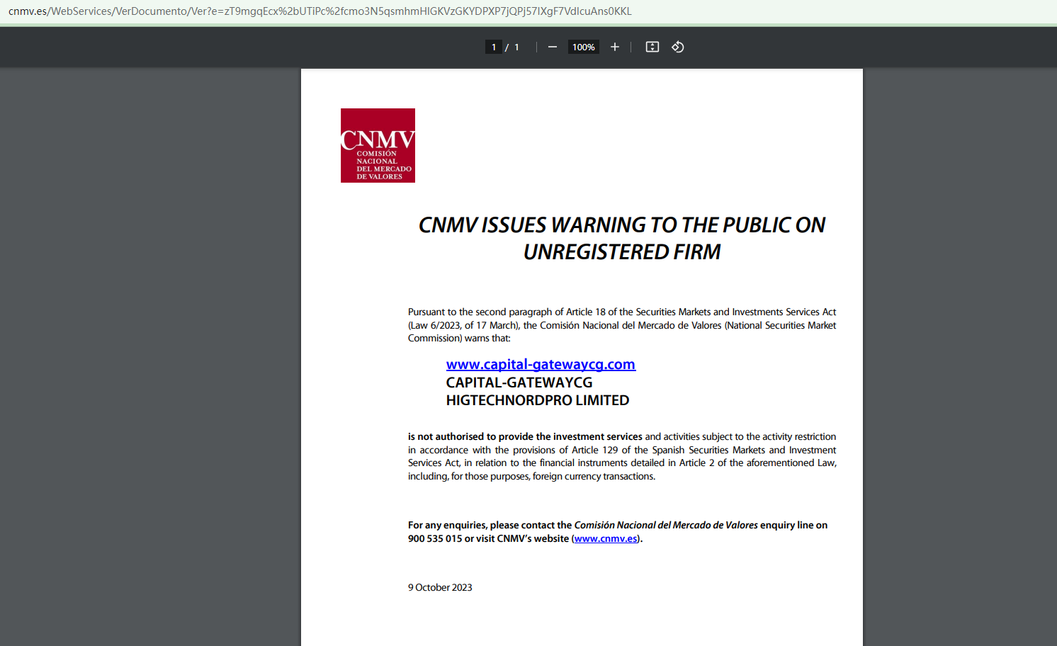 On October 9, 2023, the Comisión Nacional del Mercado de Valores (CNMV) added Capital GatewayCG to its warning list for providing investment services without authorization. https://www.cnmv.es/Portal/ResultadoBusqueda.aspx?tipo=1&sortExpression=Fecha&sortDirection=1&page=0