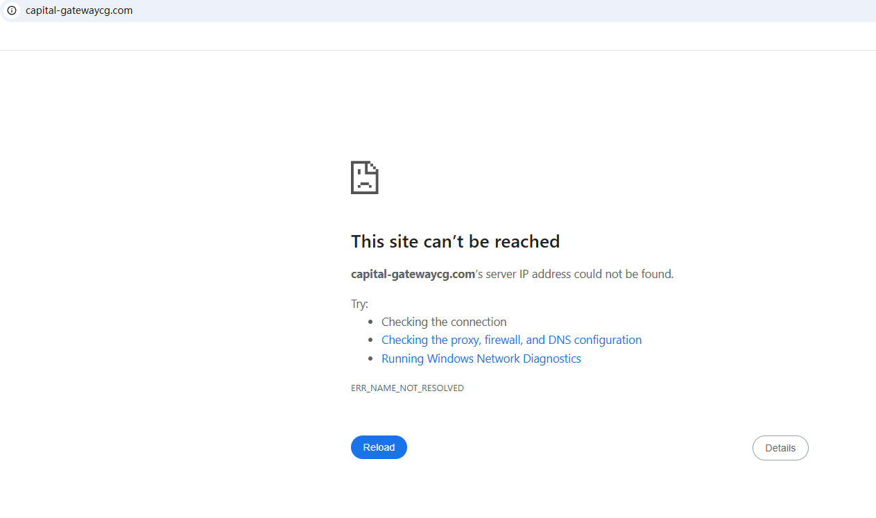 BrokersView found that the domain "https://capital-gatewaycg.com/" is currently inaccessible. This is widely regarded as a significant red flag, as the suspension of a broker's website often points to underlying regulatory or operational issues.
