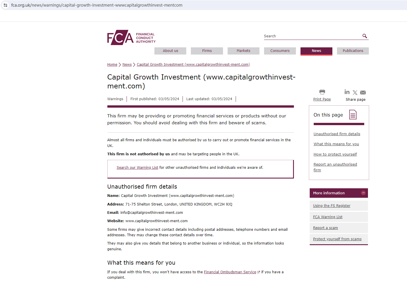 On May 3rd, 2024, the Financial Conduct Authority (FCA) issued a warning against Capital Growth Investment, believing this company might be providing financial services or products without proper authorization in the UK. https://www.fca.org.uk/news/warnings/capital-growth-investment-wwwcapitalgrowthinvest-mentcom