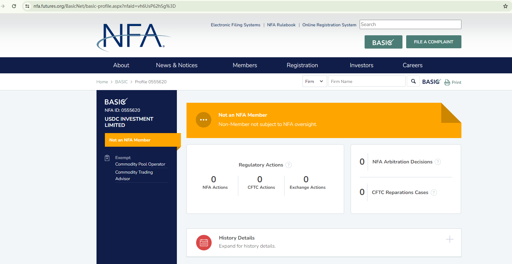 Moreover, Capital IM Limited purports to possess the ID number 0555620, allegedly issued by the US National Futures Association (NFA). However, the search results indicate that this ID is associated with an infamous scam broker, USDC Investment, a platform previously flagged by BrokersView. It's important to note that this NFA ID is solely for tracking purposes. In summary, Capital IM Limited is not subject to the NFA's oversight.