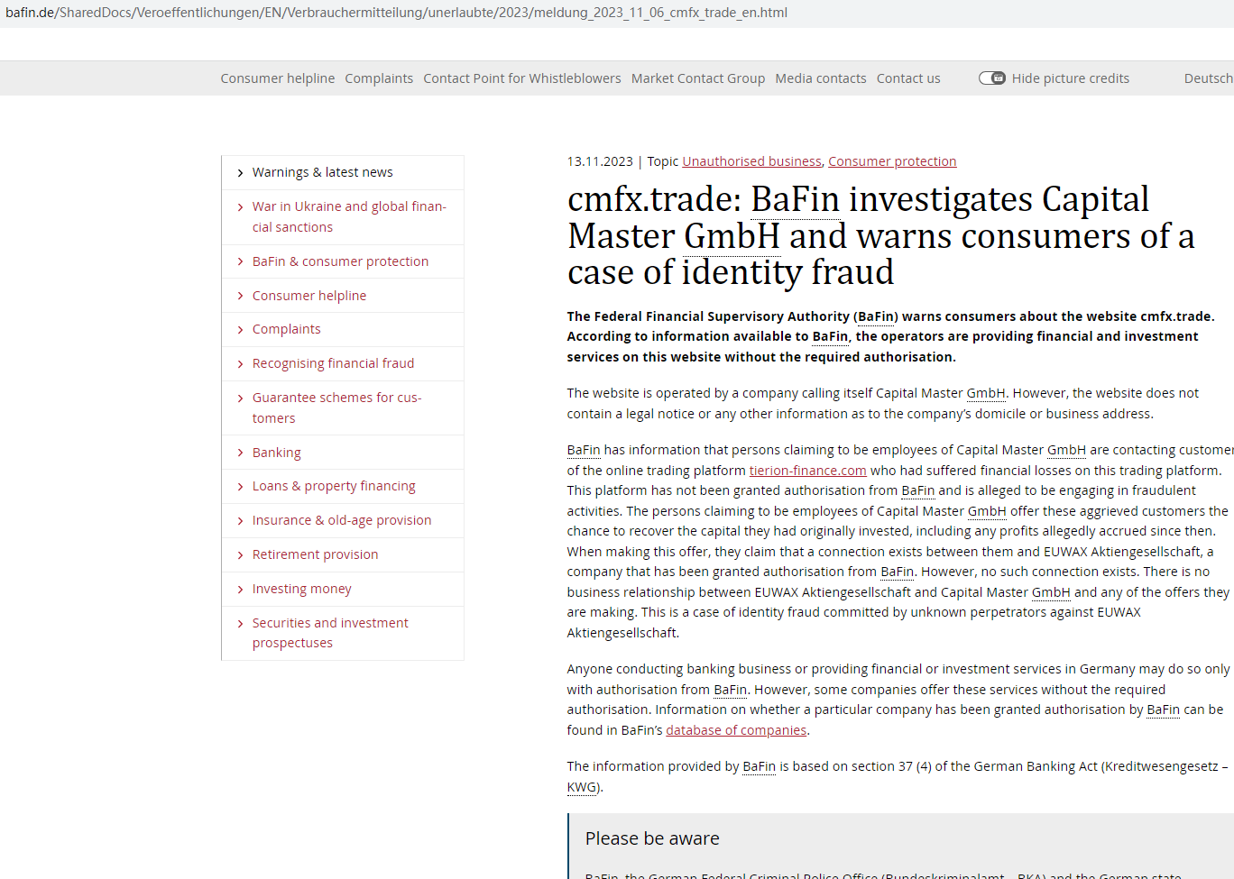 On 13 November 2023, the Federal Financial Supervisory Authority (BaFin) issued a warning that Capital Master GmBH was providing financial services or products without authorization. You may visit: https://www.bafin.de/SharedDocs/Veroeffentlichungen/EN/Verbrauchermitteilung/unerlaubte/2023/meldung_2023_11_06_cmfx_trade_en.html