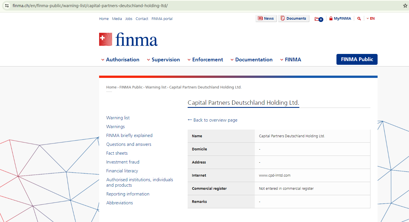 The Swiss Financial Market Supervisory Authority (FINMA) has released a warning about Capital Partners Deutschland, highlighting that it lacks the necessary commercial registration. This warning confirms its regulatory non-compliance and suggests potential fraudulent intentions.