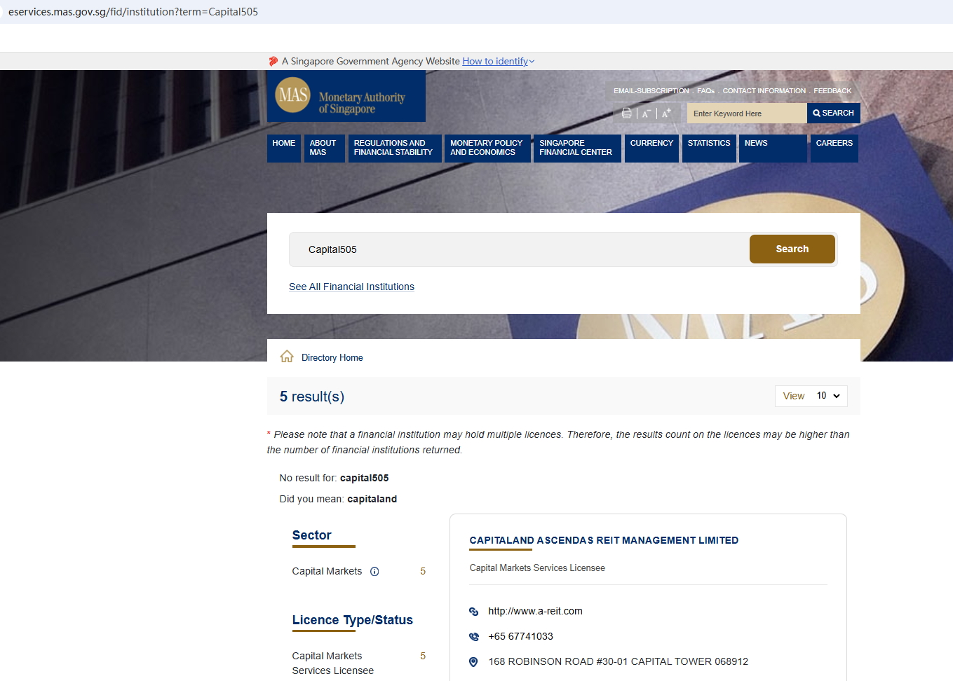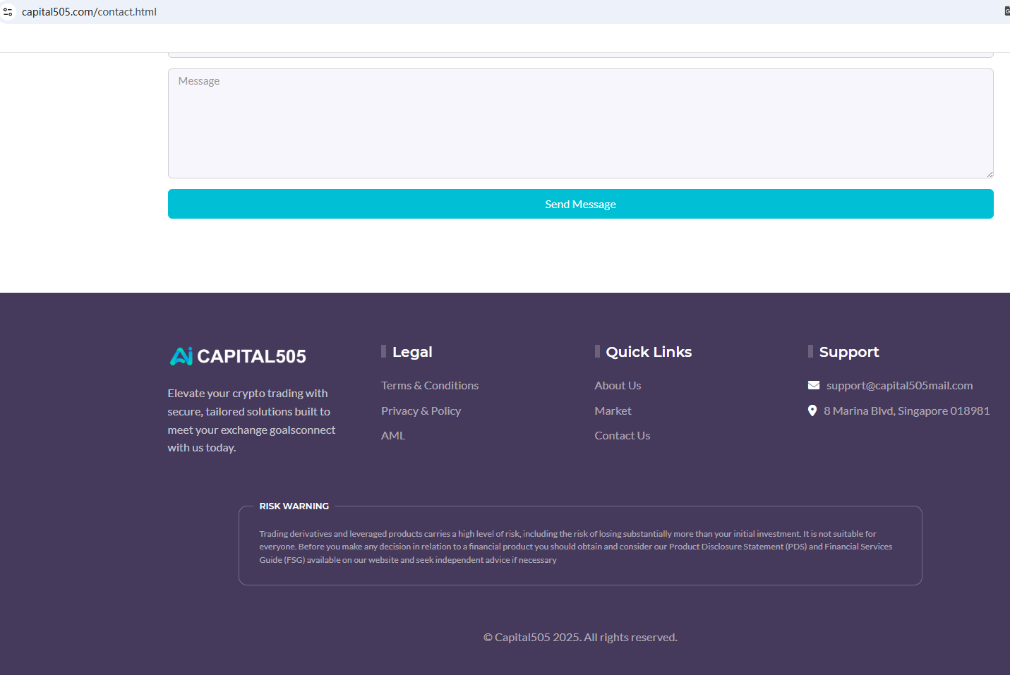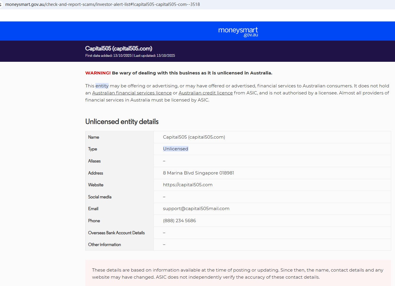 According to its website, it claims that its office address is located in Singapore, but a search revealed no matching information in the Monetary Authority of Singapore (MAS). In addition, the Australian Securities & Investments Commission (ASIC) issued a warning against Capital505, believing this company might be providing financial services or products without proper authorization.