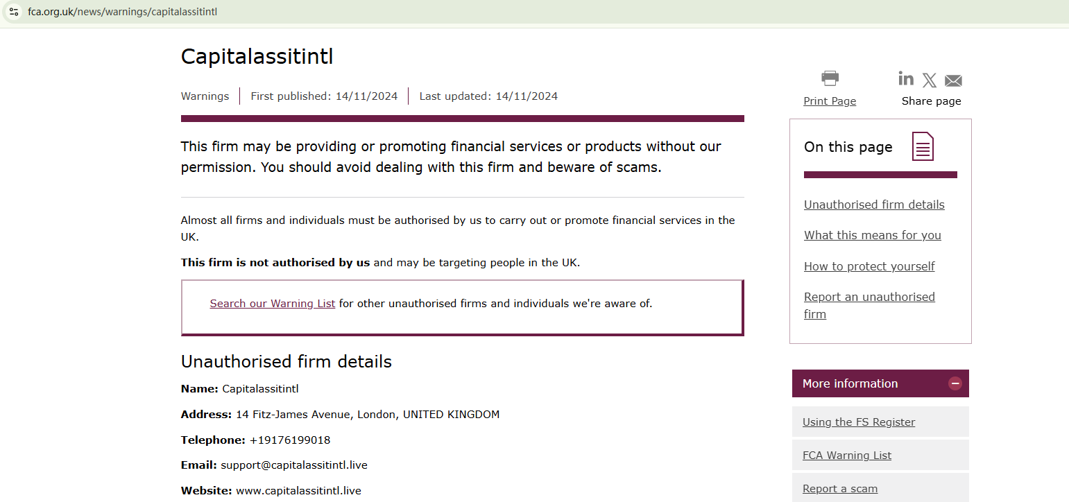 On November 14, 2024, the Financial Conduct Authority (FCA) issued a warning against Capitalassitintl, believing this company might be providing financial services or products without proper authorization in the UK. https://www.fca.org.uk/news/warnings/capitalassitintl