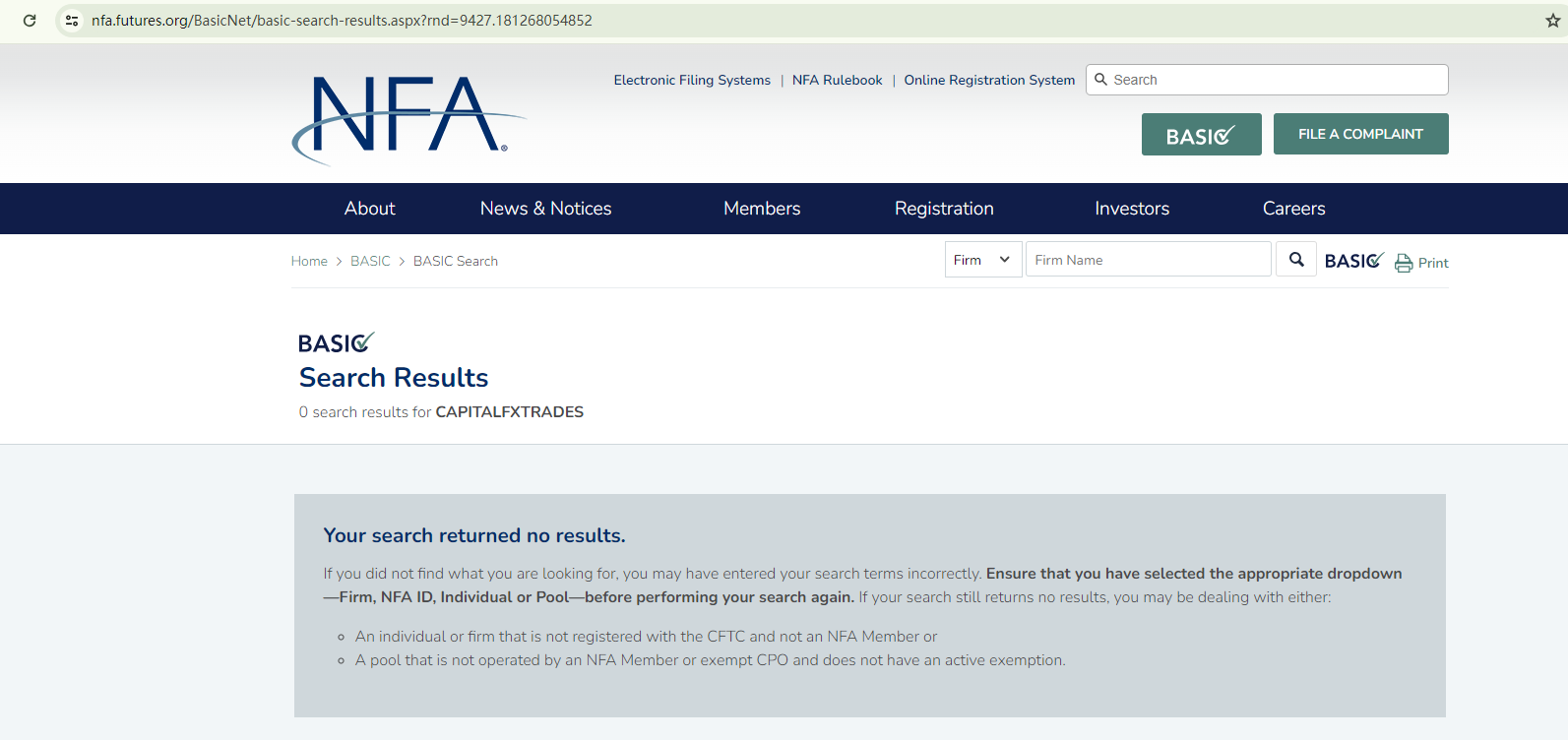 Although CAPITALFXTRADES lists a US address, it does not fall under the jurisdiction of the National Futures Association (NFA), as there are no corresponding records in the NFA register.