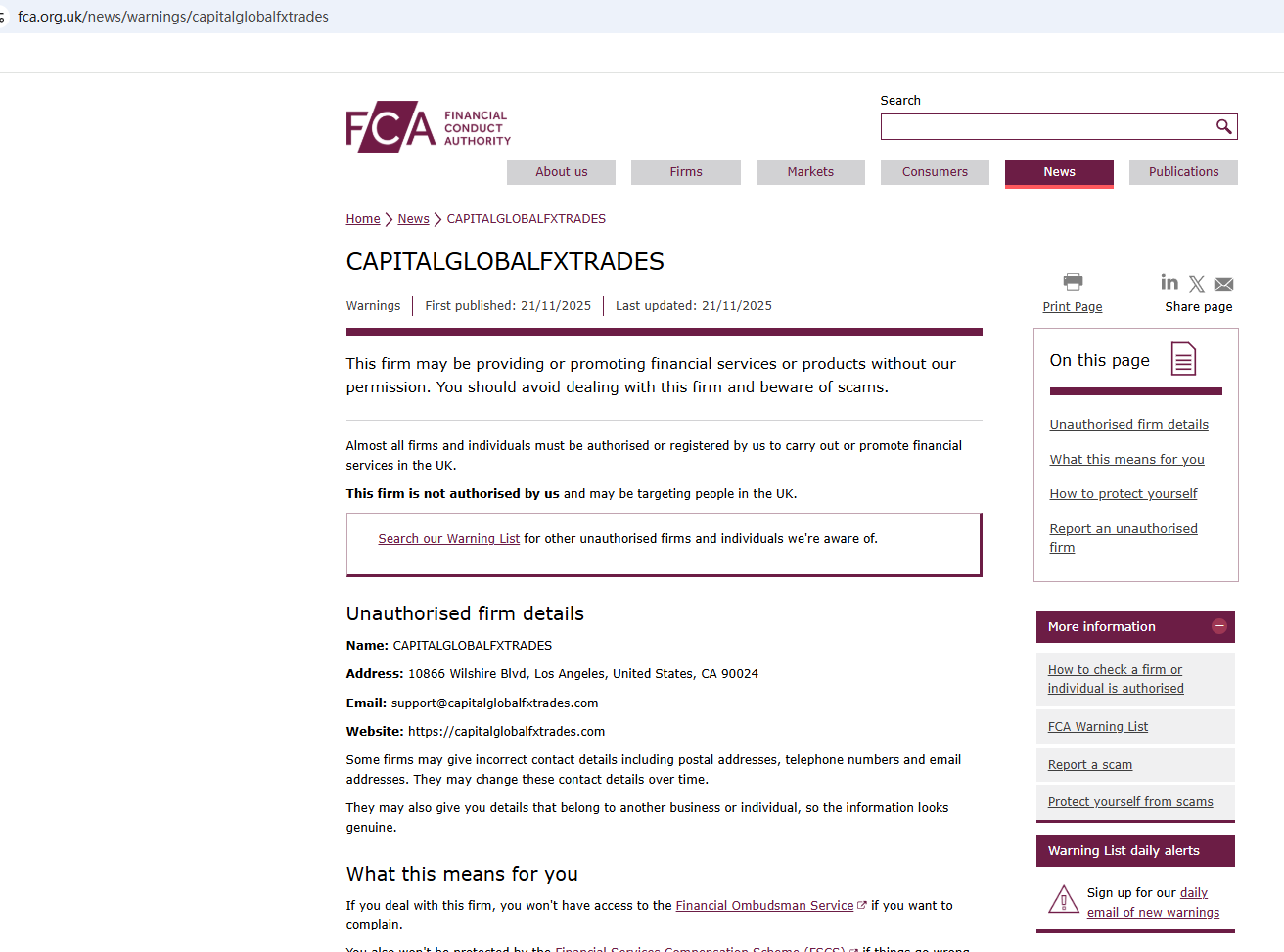 On November 21, 2025, the Financial Conduct Authority (FCA) issued a warning regarding CAPITALGLOBALFXTRADES suspecting that this company may be offering financial services or products without the necessary authorization. https://www.fca.org.uk/news/warnings/capitalglobalfxtrades