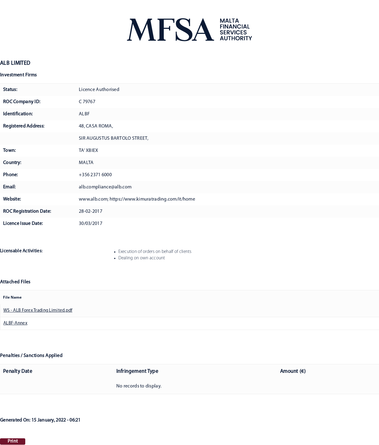 Upon investigation, the company name corresponding to Malta MFSA 79767 is ALB LIMITED, and the registration website is www.alb.com, www.kimuratrading.com/it/home. Our investigation also found that the design of the web page www.alb.com and capitaliafx.com are similar. Obviously CapitaliaFX pretended to be regulated by MFSA.