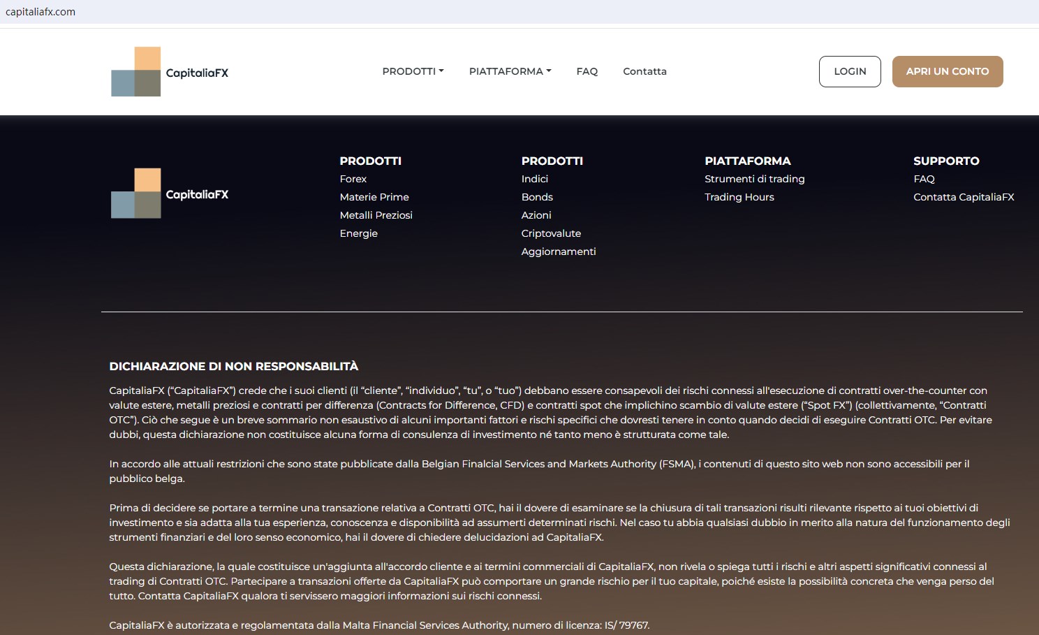 CapitaliaFX claims to be authorized and regulated by the Malta Financial Services Authority (MFSA), with license number: IS/79767, and provides Wide range of financial services, including Forex, Commodities, Metals, Energy, Indexes, and Cryptocurrencies and more instruments in global markets.