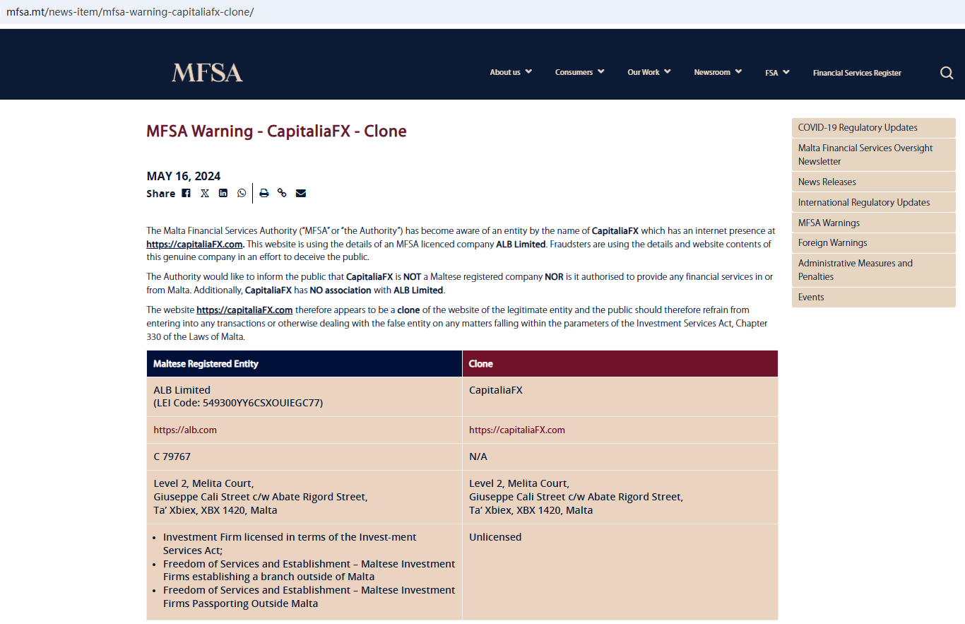 On 16 May 2024, the Malta Financial Services Authority (MFSA) issued a warning against CapitaliaFX (capitaliaFX.com), believing this company is a case of identity theft. CapitaliaFX.com is using the details of an MFSA licenced company ALB Limited. You may visit: https://www.mfsa.mt/news-item/mfsa-warning-capitaliafx-clone/.